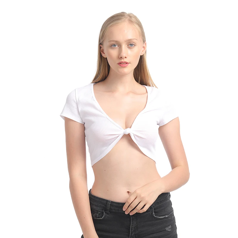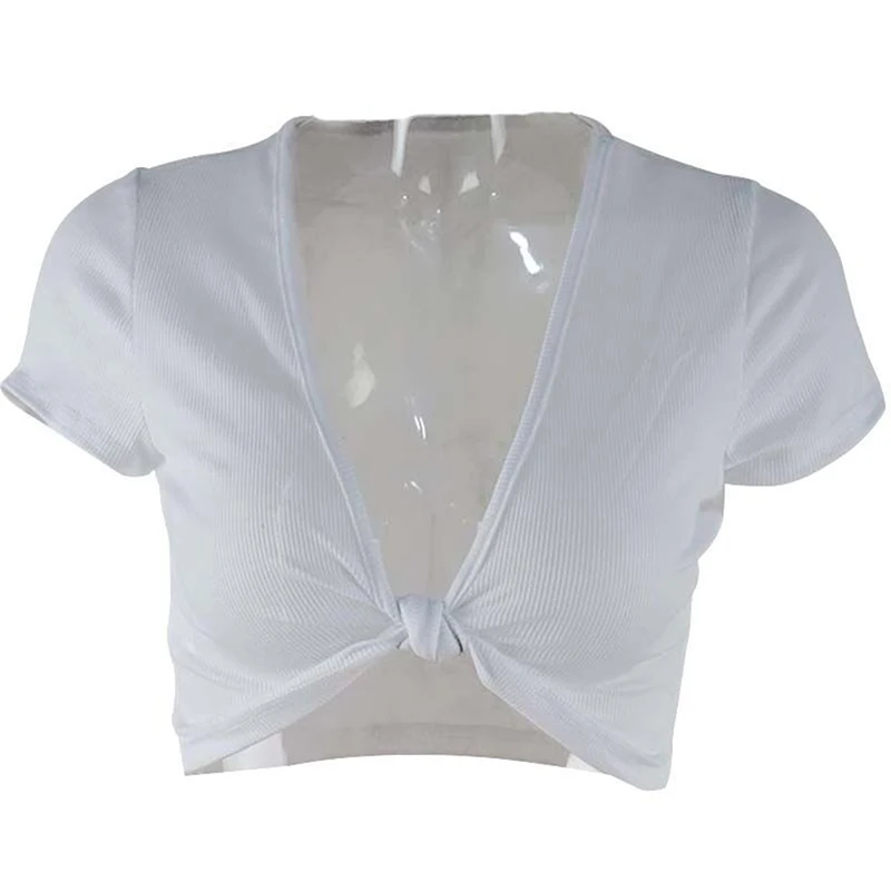 Сексуальный белый топ с глубоким v-образным вырезом, узкая облегающая футболка с узлом, женская летняя Элегантная футболка с коротким рукавом 2020