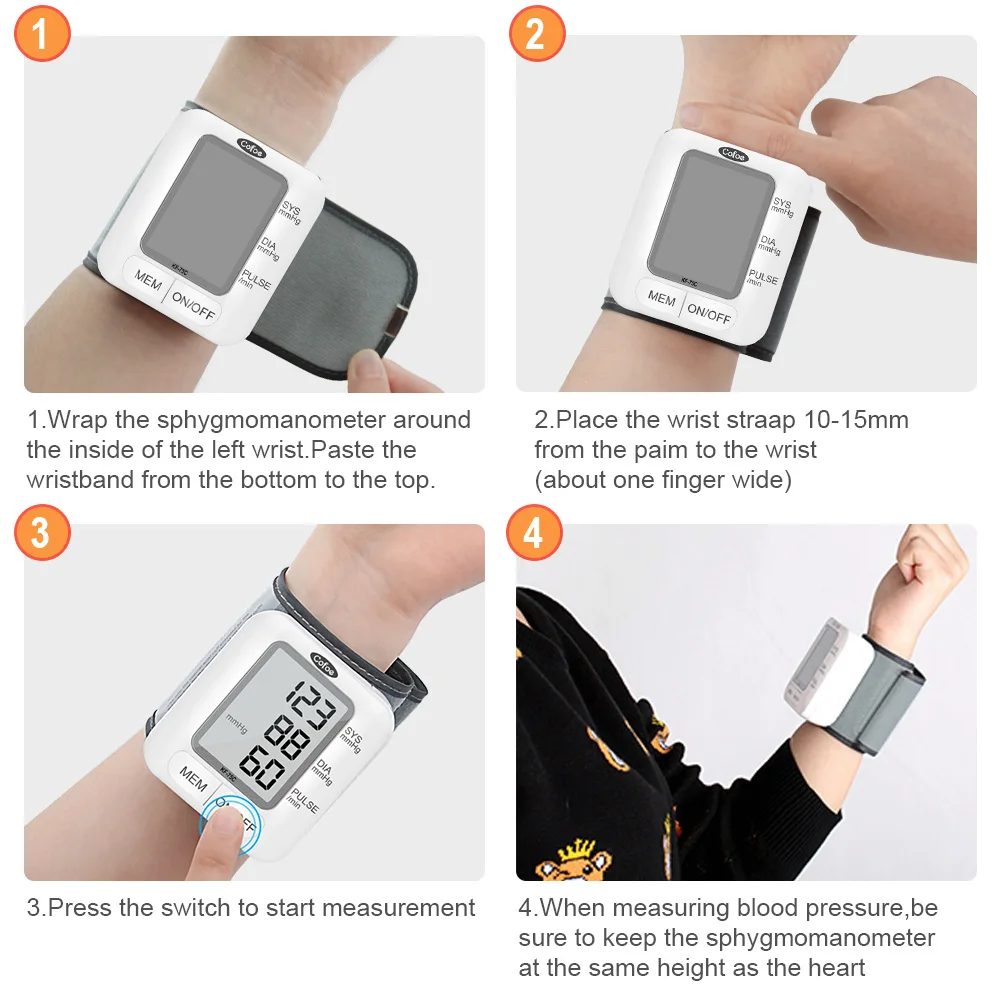 -Название продукта: кровяное давление на запястье -Модель: KF-75C -Дисплей: большой светодиодный экран -Размер: 67 мм * 78 мм * 62 мм -Вес: 95 г (без батареек) -Батарея: 6 В (2 щелочные батареи AAA не входят в комплект) -Положение: измерение и Мониторинг Артериального Давления -Диапазон отображения частоты пульса: 40-150 раз/мин -Диапазон обнаружения: 0,0-40,0 кПа (0-300 мм рт. Ст.) -Память данных: 192 комплектов