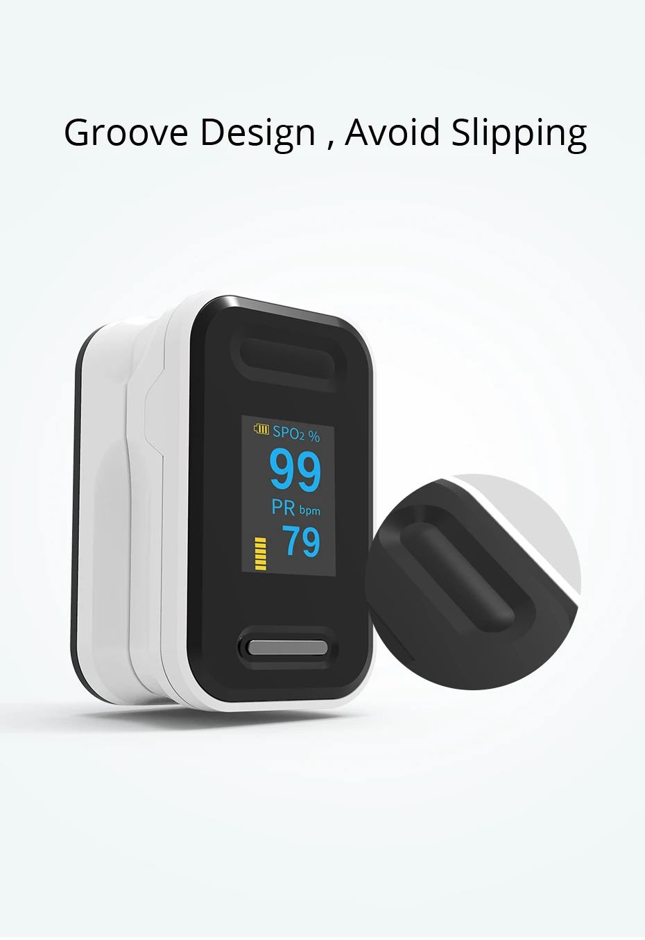 Продвинутая технология двойного OLED-дисплея помогает пользователю получить более яркое и четкое видение информации от импульсного оксиметра. Также пользователь может увидеть частоту пульса и Плетизмограф в этом oled-дисплее. Дисплей с четырьмя направлениями позволяет удобно просматривать проверенный результат в любом направлении.