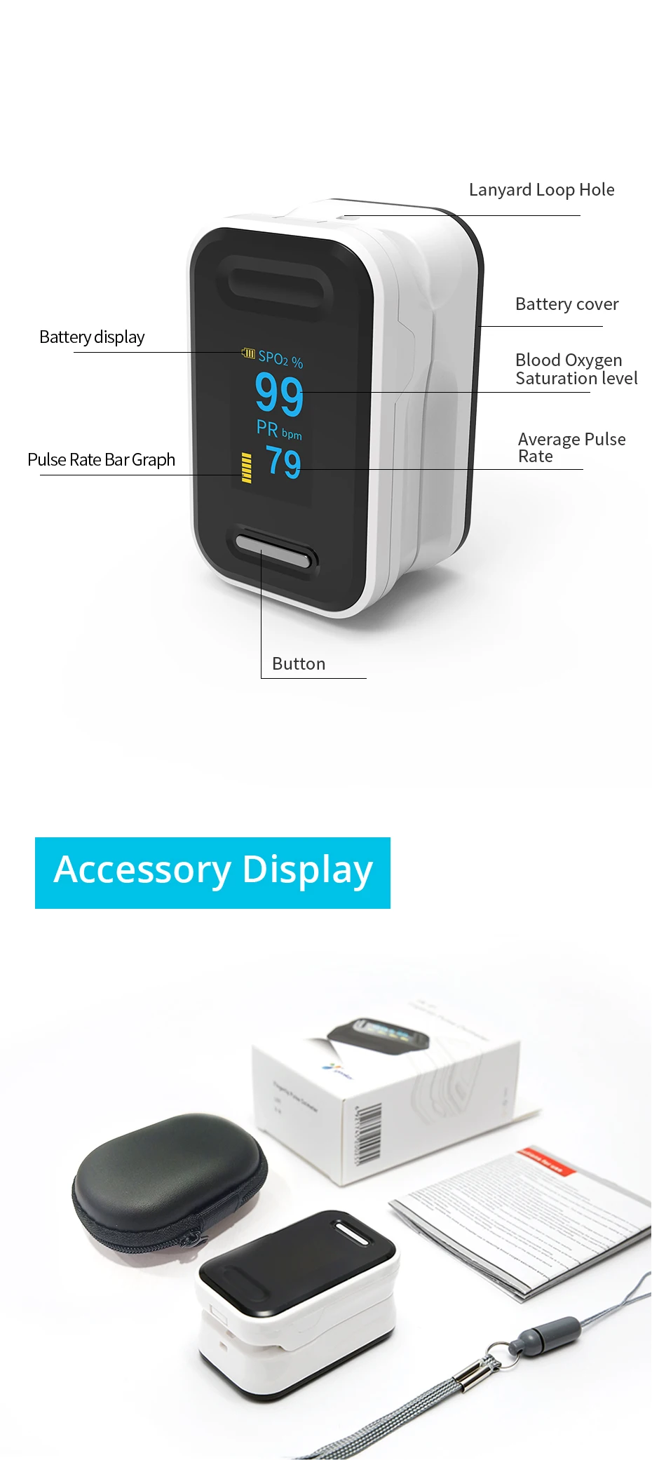 Пальцевой Пульсоксиметр может точно определить ваш SpO2 (уровень насыщения кислородом в крови) и PR (частота пульса) после клинических и профессиональных испытаний, быстрые показания SpO2, измерение пульса и отображение его удобно на большом цифровом ярком oled-дисплее.