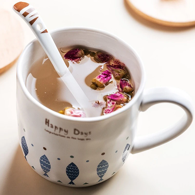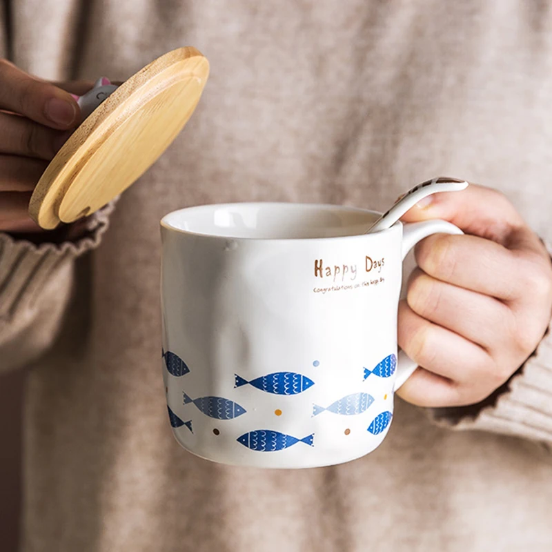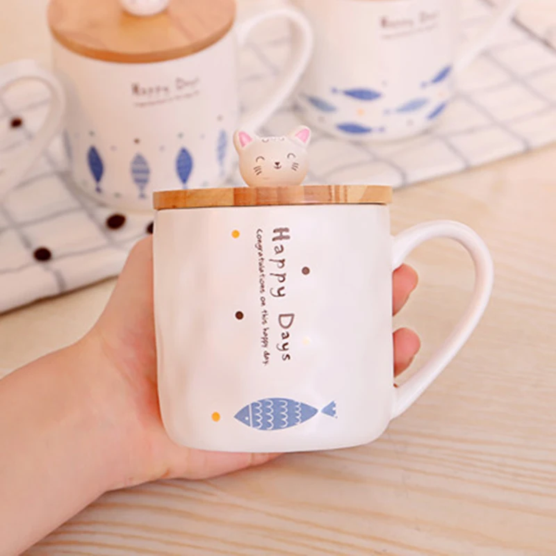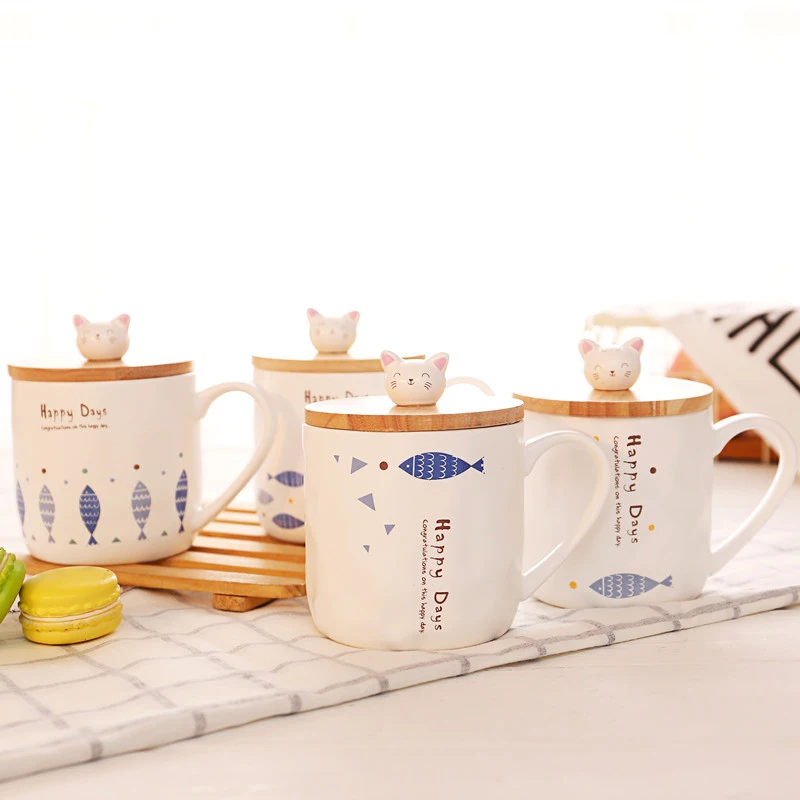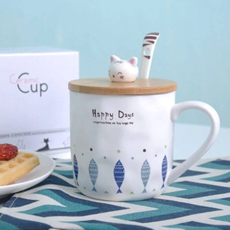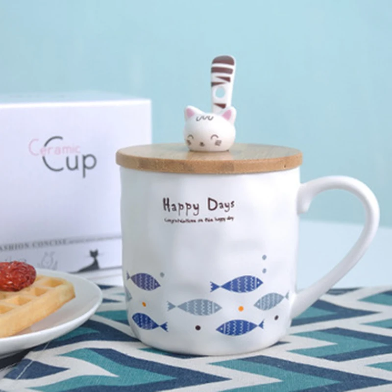 Стиль: керамическая кружка с ложкой и крышкой с изображением кота и рыбы