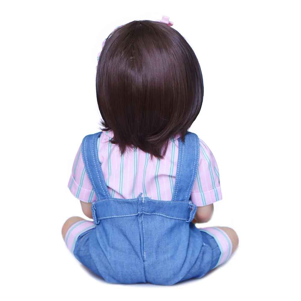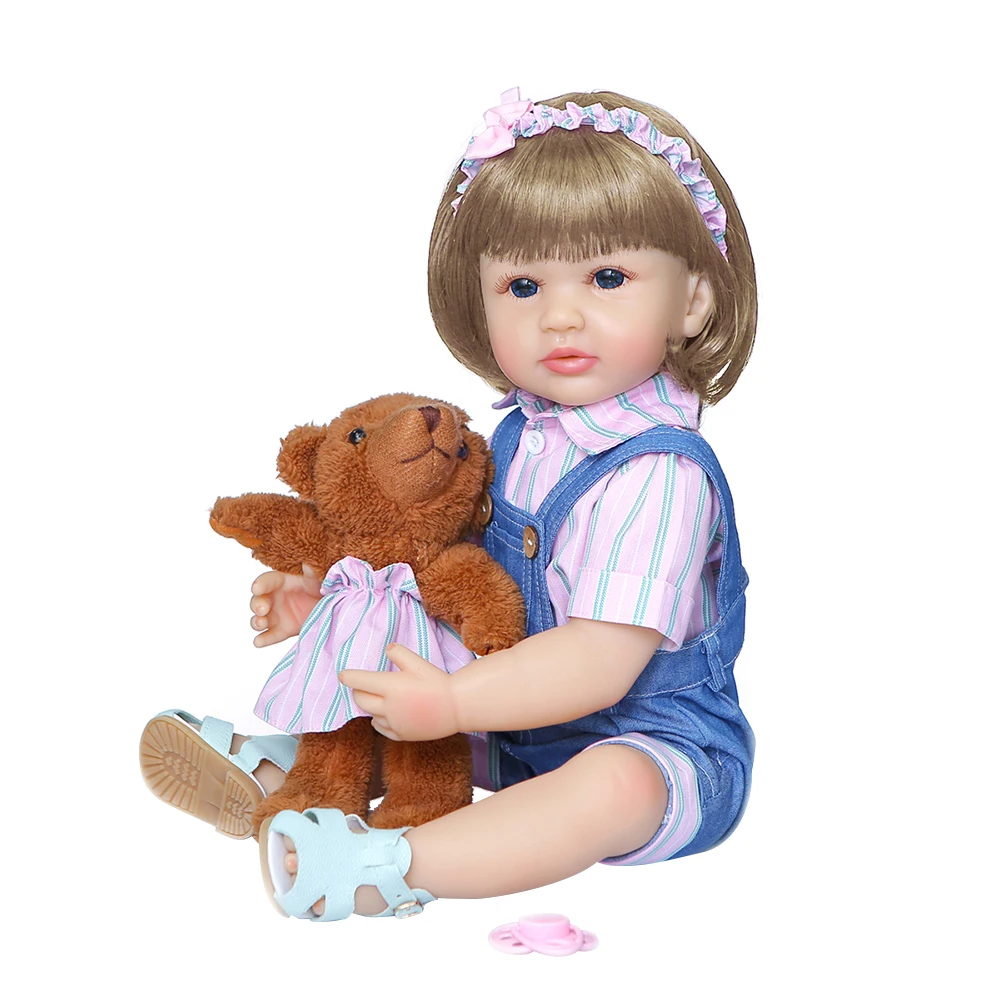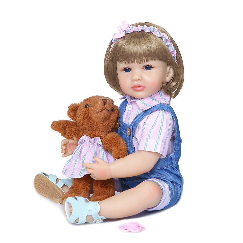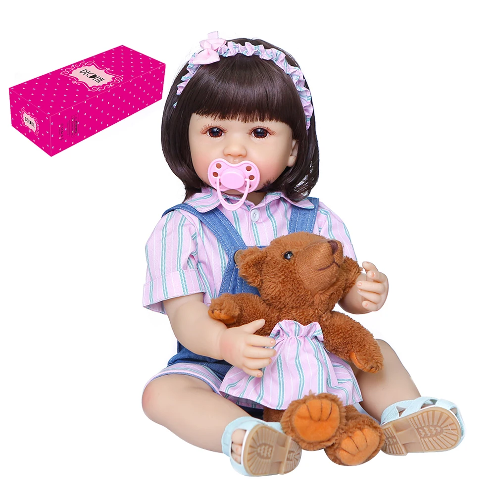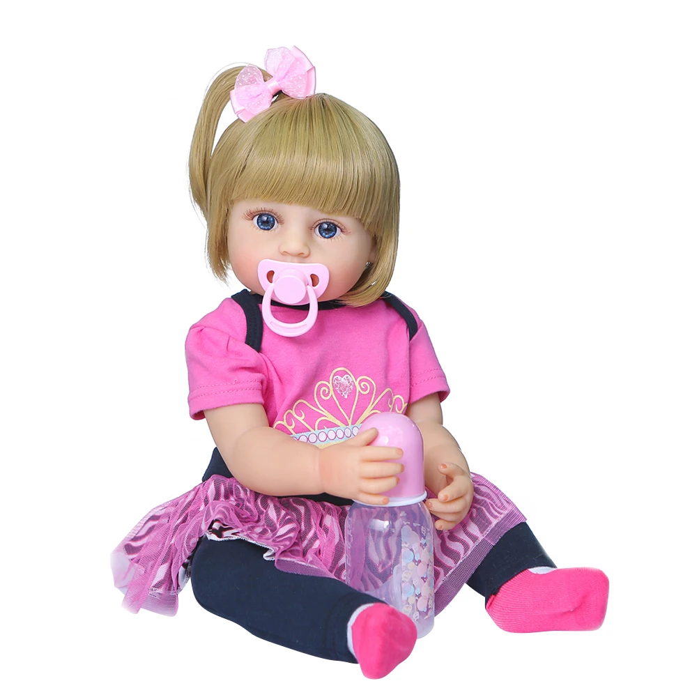 Эта кукла с полным силиконовым виниловым корпусом, в настоящей детской одежде, 22 дюйма от головы до пальца, мягкая на ощупь, как настоящий ребенок. И он может войти в воду, чтобы сопровождать ребенка, чтобы принять душ. Идеальный ребенок сопровождать игрушки, фестивали и подарки на день рождения, сбор кукол.