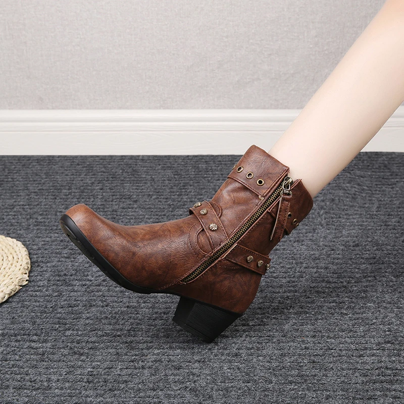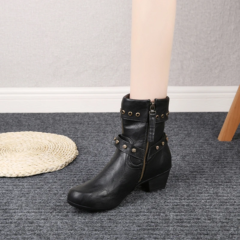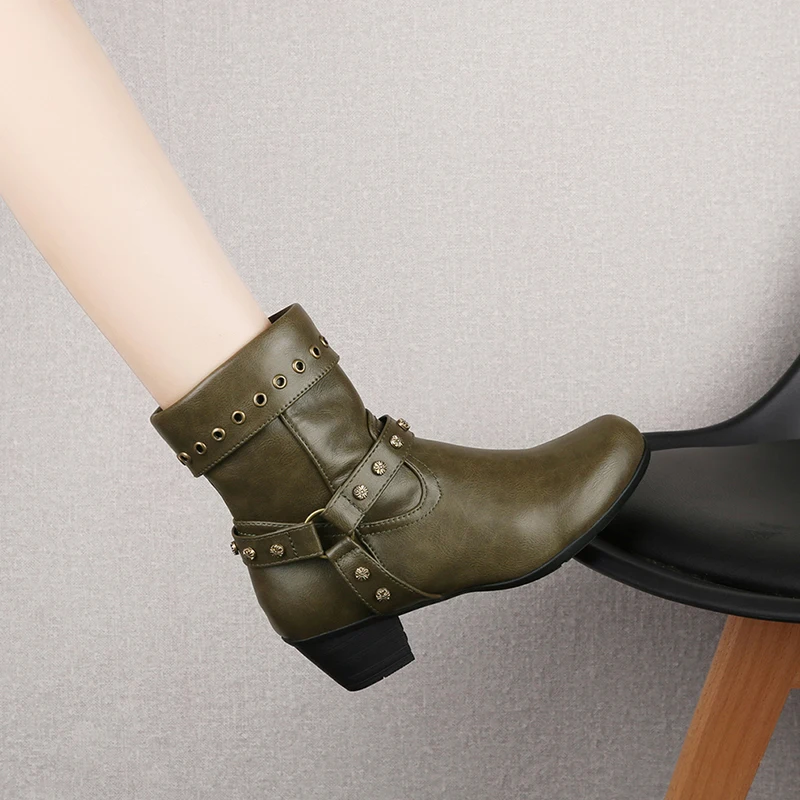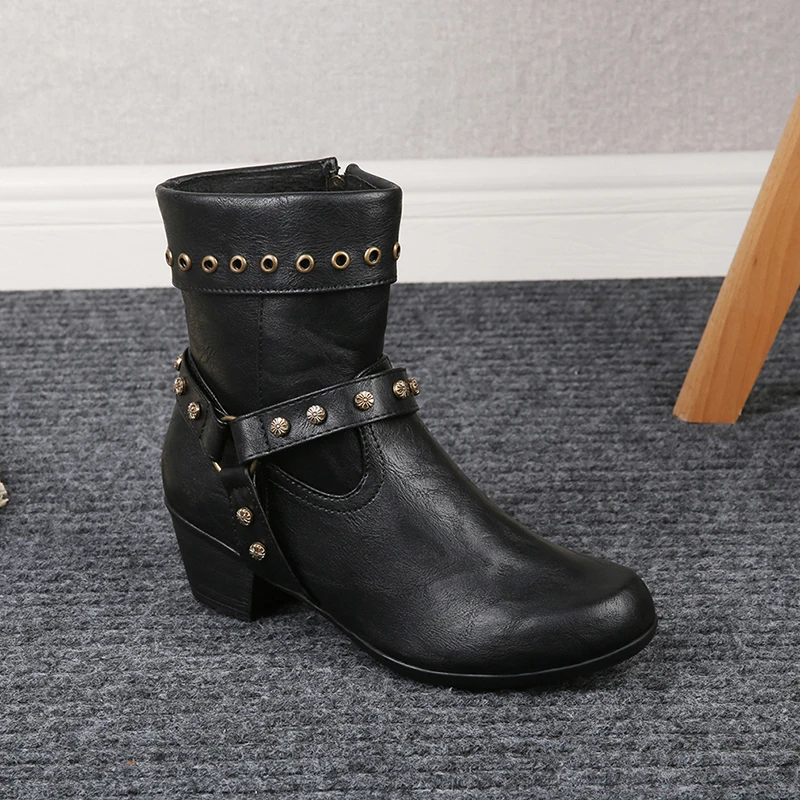 Женские ботильоны; Модная стильная обувь на заклепках; Женская кожаная обувь; Женские сапоги с ремешком и пряжкой; Не сужающийся книзу массивный каблук женские панк ботинки Rome