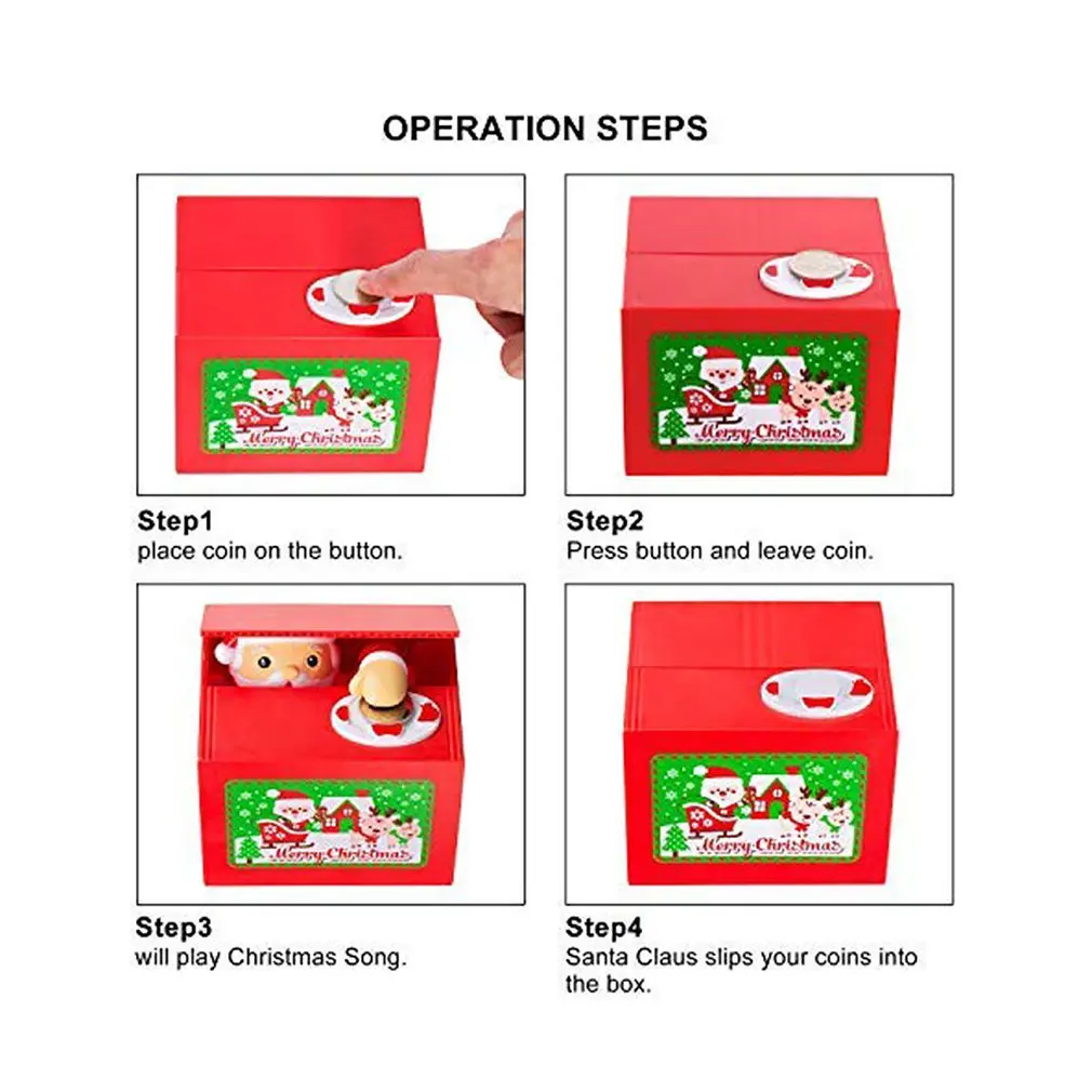 Восхитительный механический Санта-Клаус выходит из картонной коробки, чтобы украсть ваши монеты, чтобы помочь вам сэкономить деньги.
