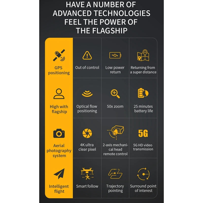 Максимальное время полета 25 минут. Интеллектуальная батарея с высокой емкостью 11,1 В 1600 мА · ч обеспечивает время полета до 25 минут. Следуйте за мной. Дрон будет автоматически следовать за вами и захватывает вас, куда бы вы ни отправились. Держать вас в кадре в любое время, легче получить сложные снимки, обеспечивает беспилотный полет и самообслуживания