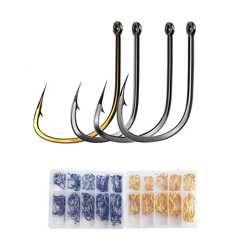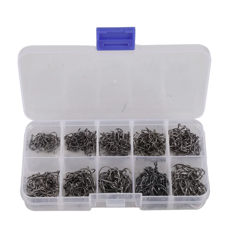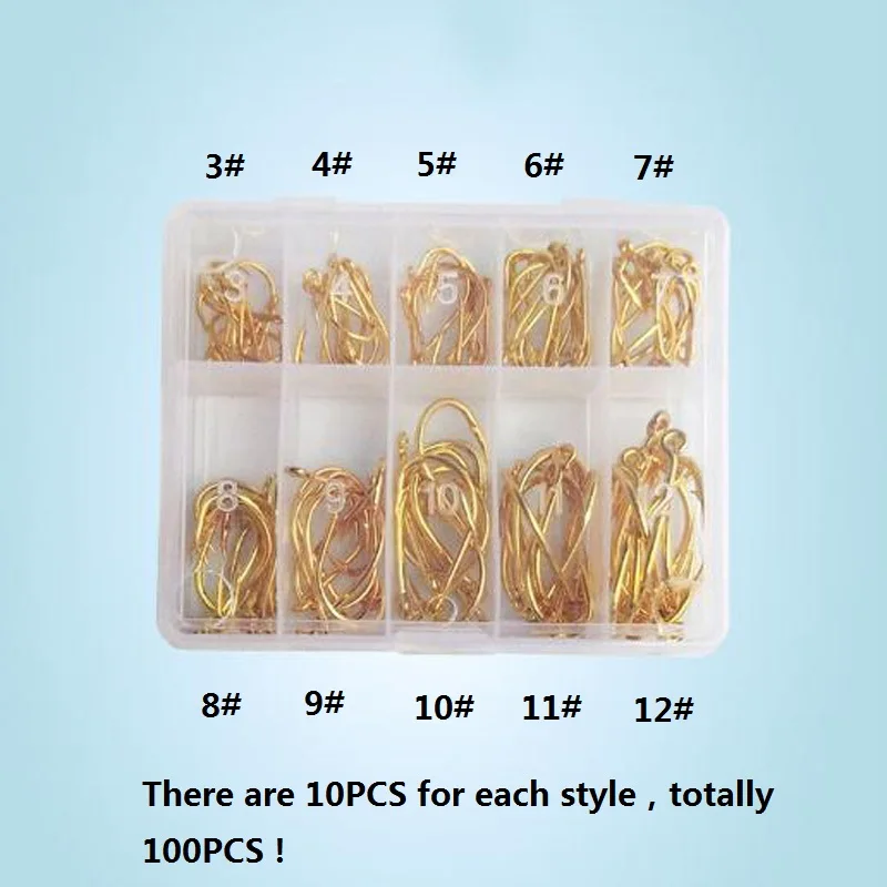 Крючки представлены в трех цветах: золотом, черном и серебристом. Среди них черный не полностью черный, только цвет немного темный, серебристо-серый. И серебро-очень яркий цвет. 1. Различные размеры от 3 до 12 #. Включает в себя 100 рыболовных крючков. 2. Он супер острый и прочный, изготовлен из высококачественной стали