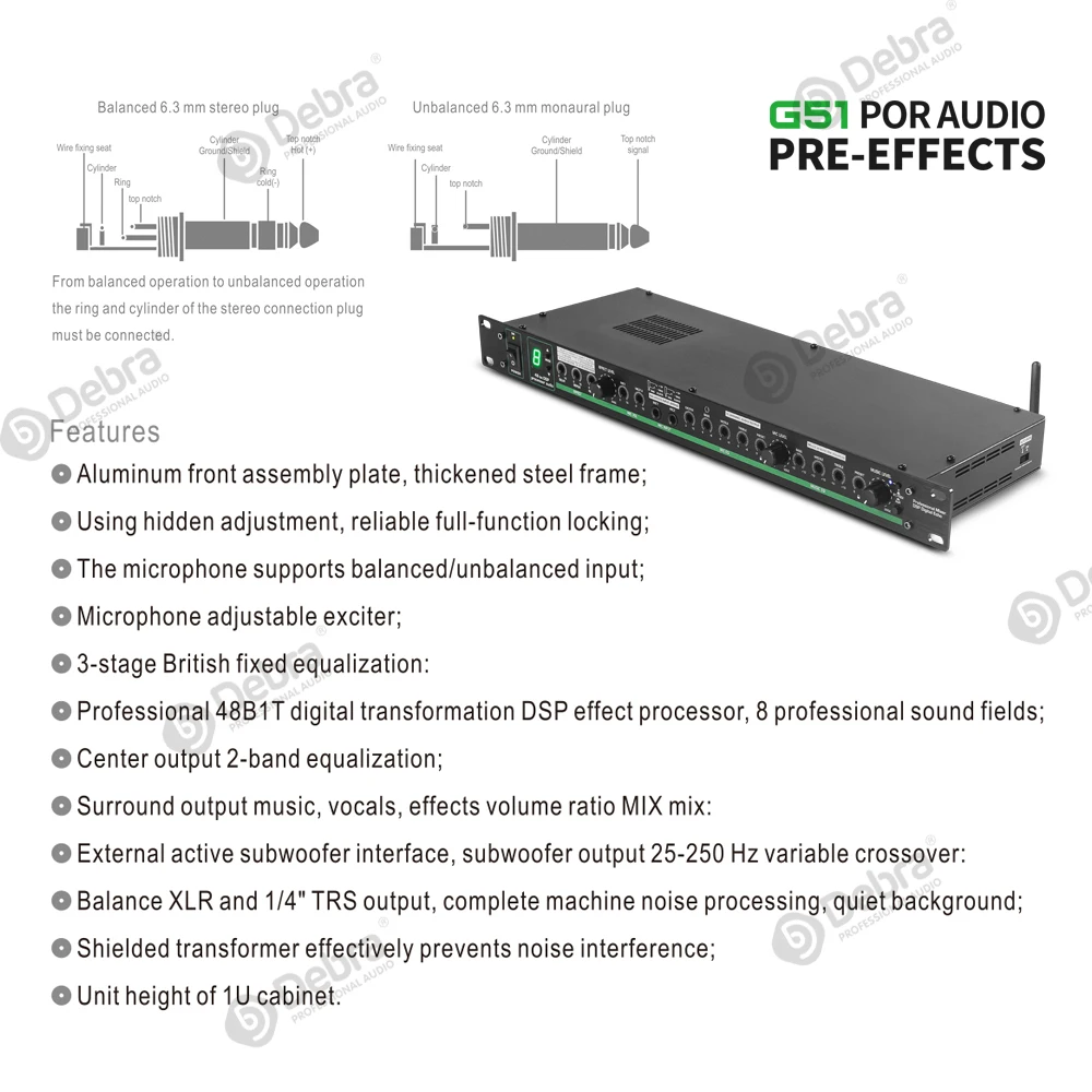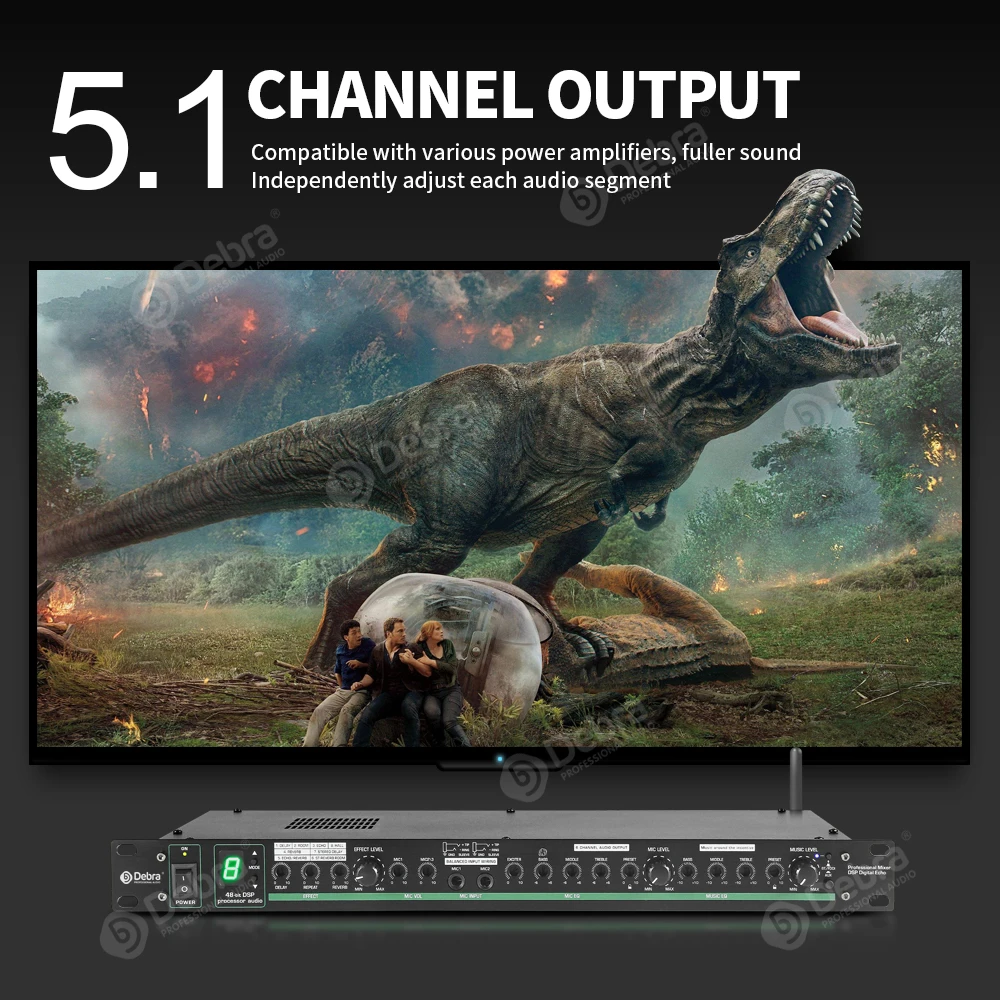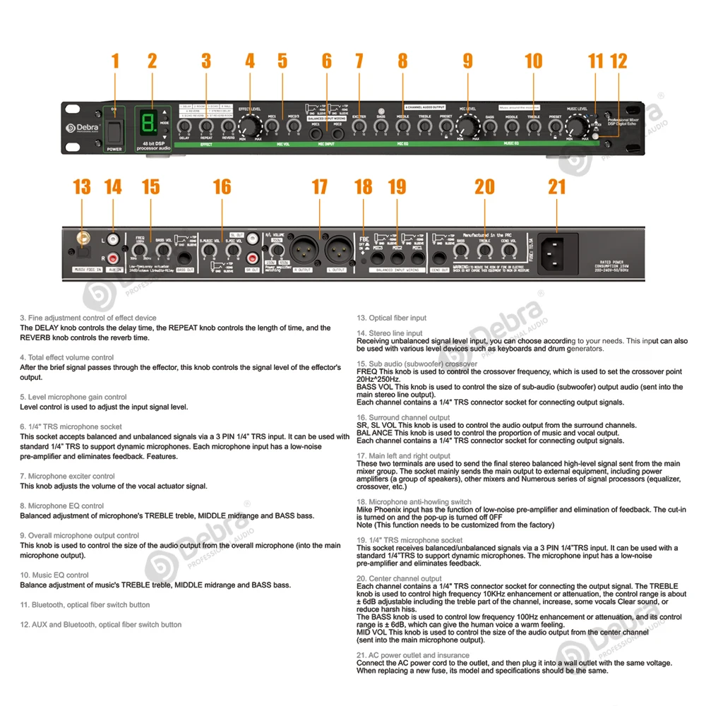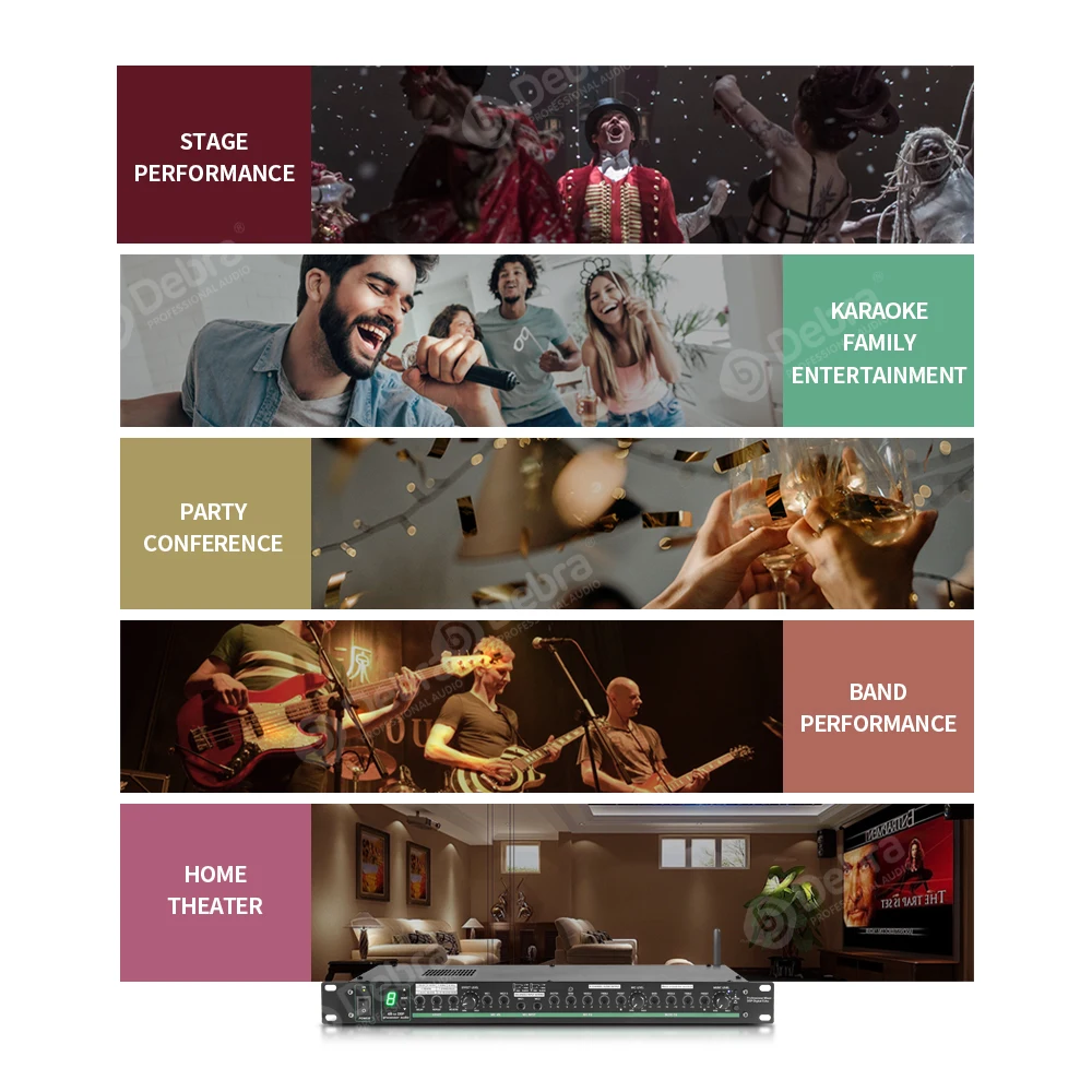 6-канальный DSP Кара 0K пре-обрабатывающий центр, встроенный арифметики точность до 48-бит DSP и до 116dB динамический диапазон, частота дискретизации 48 кГц AD/DA, упрощенная обработка использует британские усилители, чтобы сделать ваш голос пения более сладким и гладким. Есть 8 практических эффектов на обработку реверберации, что позволяет вам выполнять все до конца. 6 каналов могут быть выведены в любой комбинации! Вся машина приглушена, фоновый звук тихий. В сочетании с выходом сабвуфера после возбуждения, он мощный и шокирующий! С кронштейном, он особенно подходит для караоке 0K частных комнат, турных представлений, выступлений на сцене, или используется в школах, залах, парках и других небольших и средних представлений. Особенности ● Алюминиевая передняя Монтажная пластина, утолщенная стальная рама; ● Принять скрытую регулировку, надежный полнофункциональный замок; ● Микрофон поддерживает сбалансированный/несимметричный вход; ●Microphone Регулируемый возбудителя; ● 3-ступенчатый Британский фиксированный баланса; ● Профессионального уровня 48 бит цифрового преобразования DSP процессор эффектов, 8 ПРОФЕССИОНАЛЬНЫЙ звуковых полей; ●Centre выход 2-полосным эквалайзером; ● Музыка с объемным выходом, человеческий голос, смешивание коэффициента громкости; ● Внешний активный сабвуфер, выход сабвуфера 25-250 Гц с переменной частотой деления; ● Сбалансированный выход XLR и 1/4 "TRS, обработка всей машины, тихий фон; ● Экранированный трансформатор эффективно предотвращает помехи; ● 1U шкаф высокого качества. Готов к работе ● Проверьте, соответствует ли напряжение переменного тока, перед подключением к розетке. Машина должна быть должным образом заземлена для обеспечения безопасной эксплуатации. При выборе основного источника питания основная линия электропитания не должна быть разделена с гнездом или диммирующей проводкой. ● Аудиокабель изолирован от проводки лампы с затемнением. Используйте параллельную проводку как можно больше. Если две линии пересекаются, должен быть лучший угол Степень для минимизации помех. Несбалансированная проводка как можно короче ● Когда Главная Мощность включена, установите входной уровень на минимальное значение, которое может избежать неправильной проводки, подключения или работы. Шумный шум или повреждение машины. ● При установке акустической системы сначала Определите ширину полосы частот и Максимальный уровень звукового давления. Диапазон частот должен быть выбран соответствующим образом. В тех случаях, когда. Следующее содержание покажет вам наиболее распространенную линейную дистрибуцию, примеры приложений приведены только для справки. (6-полосная система Системы) Переключатель Этот переключатель контролирует включение и выключение. Если усилитель мощности включен позже, это повредит динамики и вызовет слишком сильный шум. Звуковое поле цифровой процессор Есть 8 профессиональных режимов звукового поля, 1. Порционный с задержкой; 2. Комната; 3. ECH0 реверберация; 4. Реверберация; 5. ECHO/REV reverberation/reverberation; 6. ST REVERB ROOM stereo reverberation room ; 7. Задержка стерео; 8. Зала лобби. ------------------------------------------------------------------------------------------------------ Параметры-микрофон Входной разъем: 1/4 "TRS сбалансированный, линейный уровень сбалансированный/несимметричный Входное сопротивление: 2K Ом Максимальный входной уровень: -20 ДБУ несимметрич