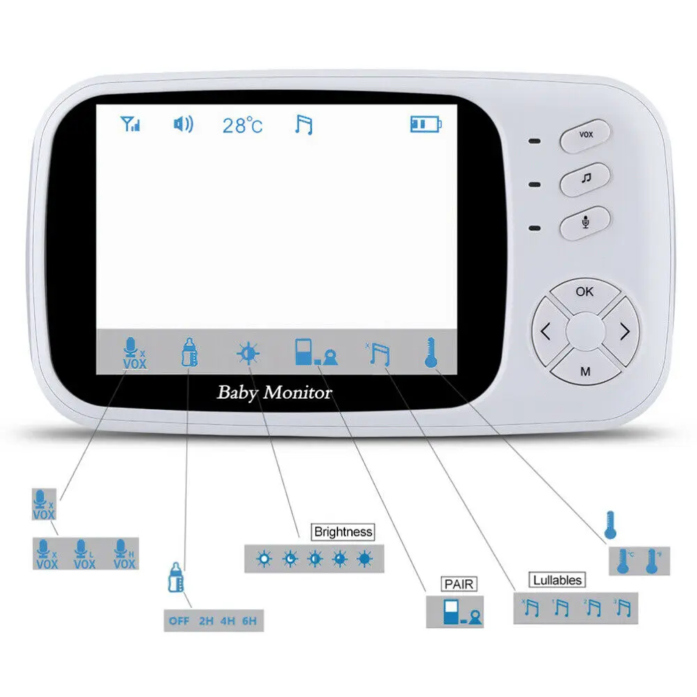 Описание Этот детский монитор также может быть прикреплен к верхней части детской кроватки или на плоской поверхности или вокруг дверной ручки для вашего удобства. Он имеет контроль температуры и влажности, обнаружение плача и двухсторонние автоматические возможности. Таким образом, вы не только обязательно услышите плач вашего ребенка, но они смогут услышать ваш голос, чтобы, надеюсь, успокоить их снова, чтобы спать, даже прежде чем вы попадете в спальню. Кроме того, вы получите различные колыбельные, чтобы помочь вашему ребенку спать по ночам намного проще. Характеристика -Цвет: белый. -Материал: пластик. -Размеры: 13x7,4x1,55 см. -Портативный дизайн, удобно носить с собой. -Позволяет ухаживать за детьми в темноте, не закрывая глаза на ребенка всю ночь. -Это видео радионяня оснащен 2,4 дюймов ЖК-дисплей экран и подключен к детскому камеру с помощью более 2,4 ГГц Беспроводная технология, четко показывать наших детях без помехи Wi-Fi. -Вы можете играть в встроенные колыбельные или использовать функцию двусторонней обратной связи для комфорта ваших детей, когда захотите. -Примечание: этот товар поставляется с британской вилкой, пожалуйста, подтвердите напряжение вашей области перед покупкой. -Уважаемый покупатель, из-за светового эффекта, яркости монитора, ручного измерения и т. д. могут быть некоторые незначительные различия в цвете и размере между фотографией и фактическим товаром. Искренне надеемся на ваше понимание! Спасибо! Спецификация Общий -Частота передачи: ISM 2400-2483,5 МГц -Мощность передачи: 17dBm -Свободный эффективный диапазон: 160 футов/50 м в помещении/850ft/260 м на открытом воздухе, линия видимости -Рабочая температура: 14-122 по Фаренгейту/-10-+ 50 по Цельсию -Рабочая влажность:
