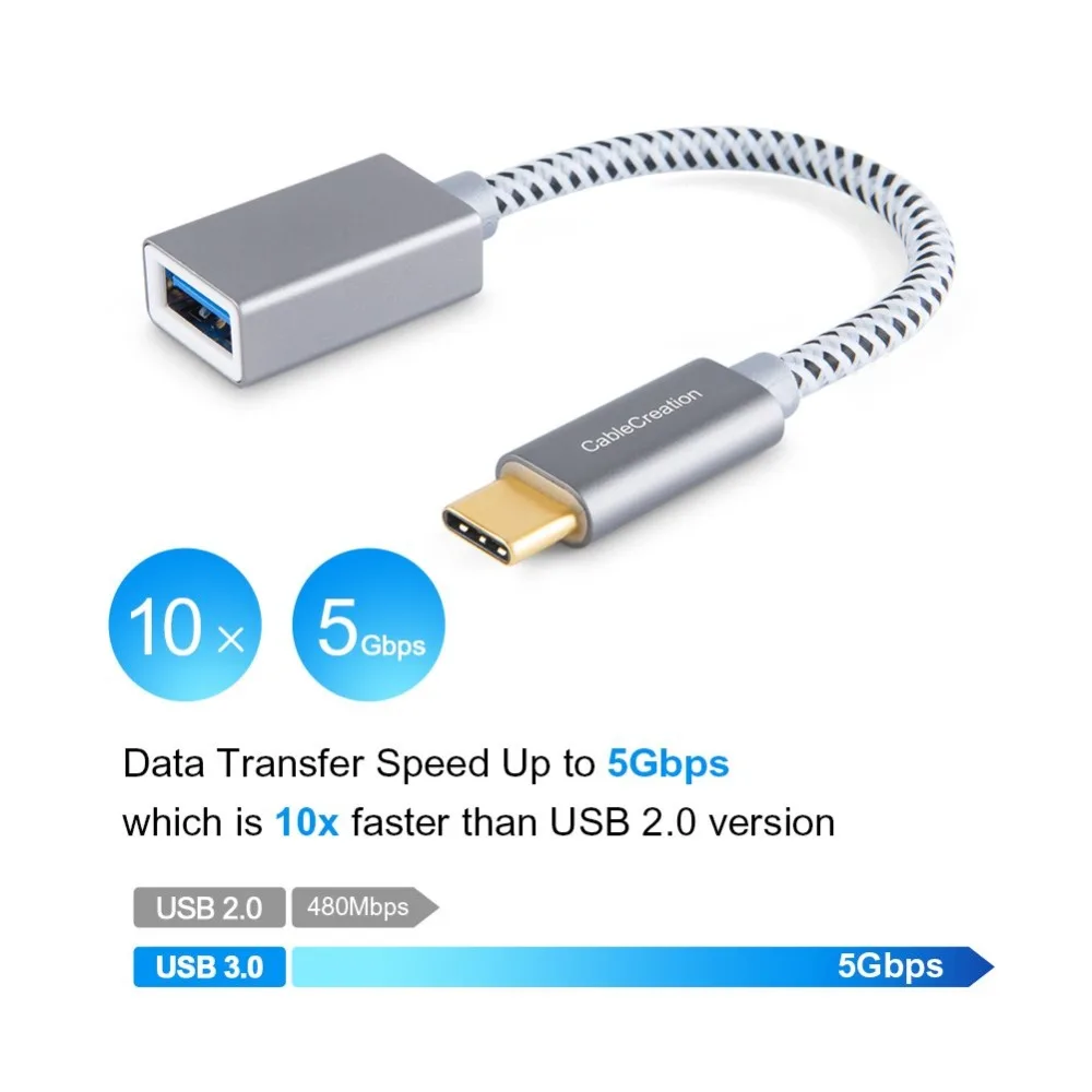 Кабель USB-C USB-A адаптер поддерживает высокоскоростную передачу данных до 5 Гбит/с, синхронизирует ваши фотографии, видео и музыку за считанные секунды.