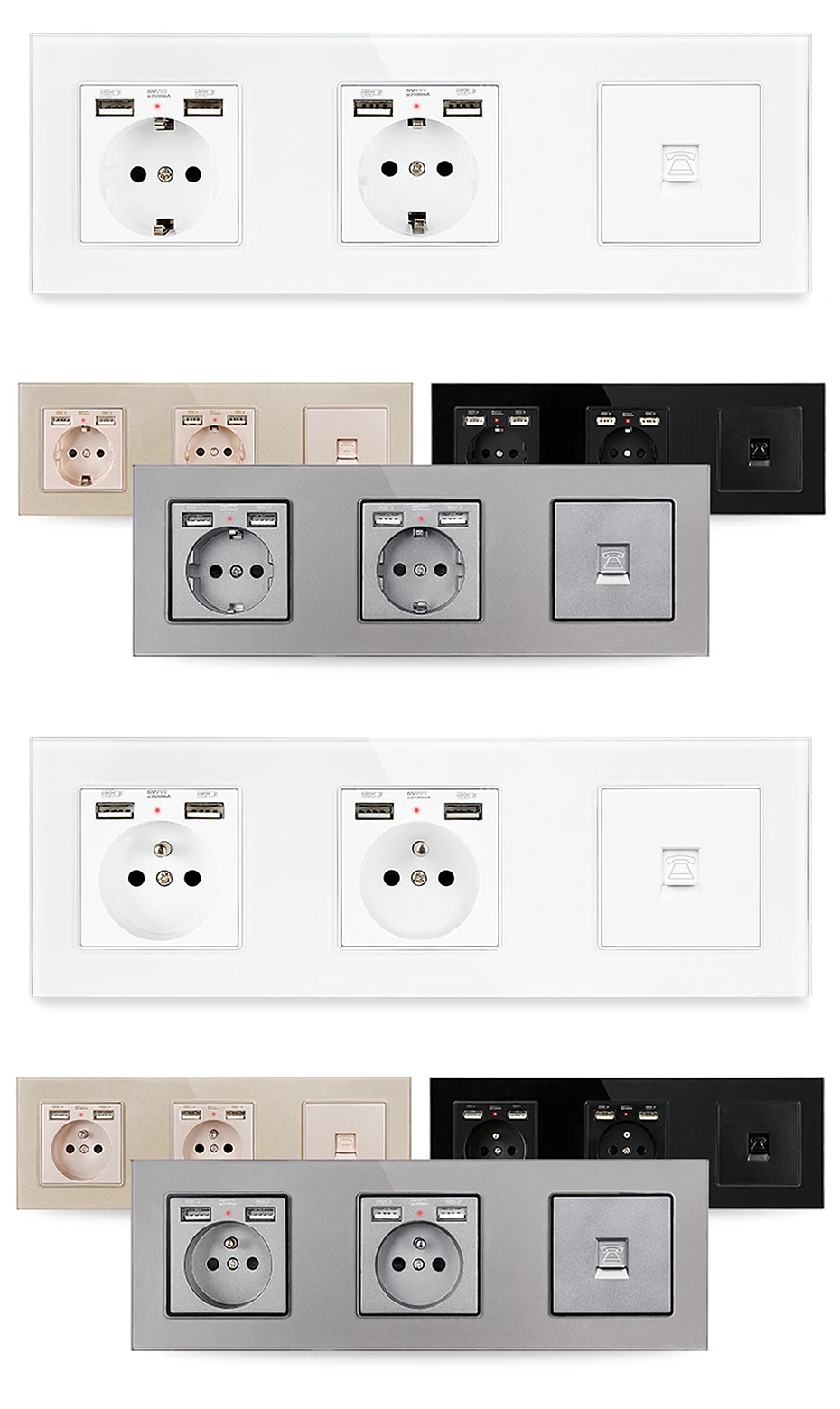 UNKAS Glass Panel Dual EU French Standard Wall Socket with 4 USB 16A Charging Port + RJ11 Telephone Jack 258mm * 86mm Outlet