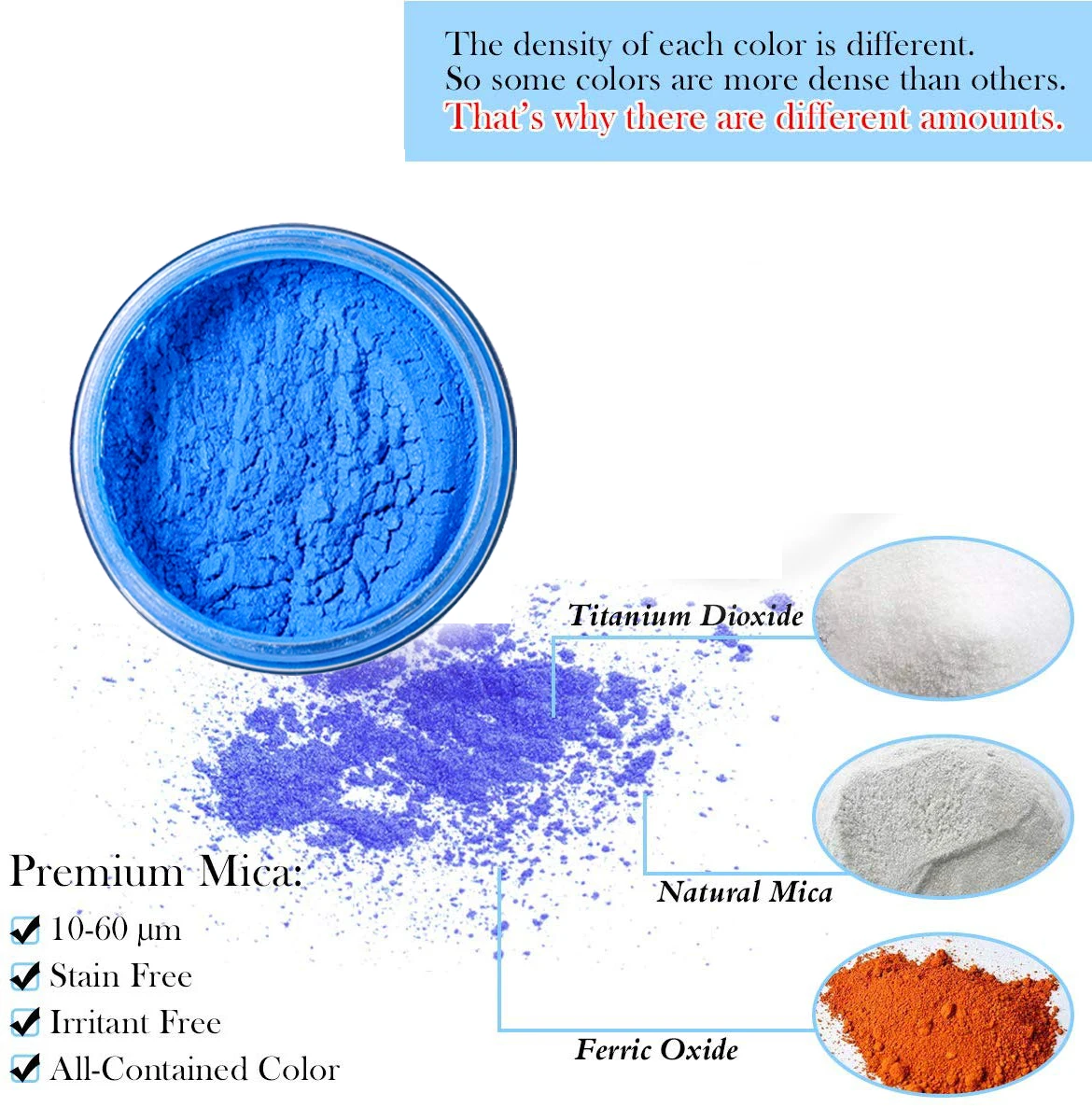 Мыло -Вы можете смешать прямо в растопленное мыло или смешать 1 чайную ложку порошка слюды с 1 столовой ложкой изопропилового спирта или глицерина. Более поздний метод позволяет быстрее смешивать цвет. Эпоксидом: -Смешайте в отвердитель, чтобы предотвратить слипание порошка слюды. -Для достижения полного цвета мы рекомендуем использовать 2-3% слюды по весу для общей комбинированной смеси смолы и отвердителя. Например, если вы используете 5oz эпоксидной смолы, мы рекомендуем использовать 0,1 oz порошок слюды. -Если вы производите эпоксидную смолу, которая требует некоторой прозрачности, например, речной стол, начните с 0.1% слюды порошка по весу, чтобы полностью объединить смоляную и твердую смесь, затем постепенно увеличивайте процент для достижения градиентного эффекта. -Для напольных покрытий, мы рекомендуем использовать 2-3% порошок слюды по весу, чтобы общий объем смолы и отвердителя смесь при установке при кадровой частоте 60 мил (1,5 мм) в толщину.