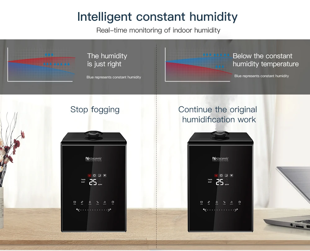 Интеллектуальный режим для постоянной влажности: Когда влажность в помещении достигает заданной влажности, увлажнитель автоматически отключается. Когда влажность снова ниже установленного уровня, она включается автоматически.