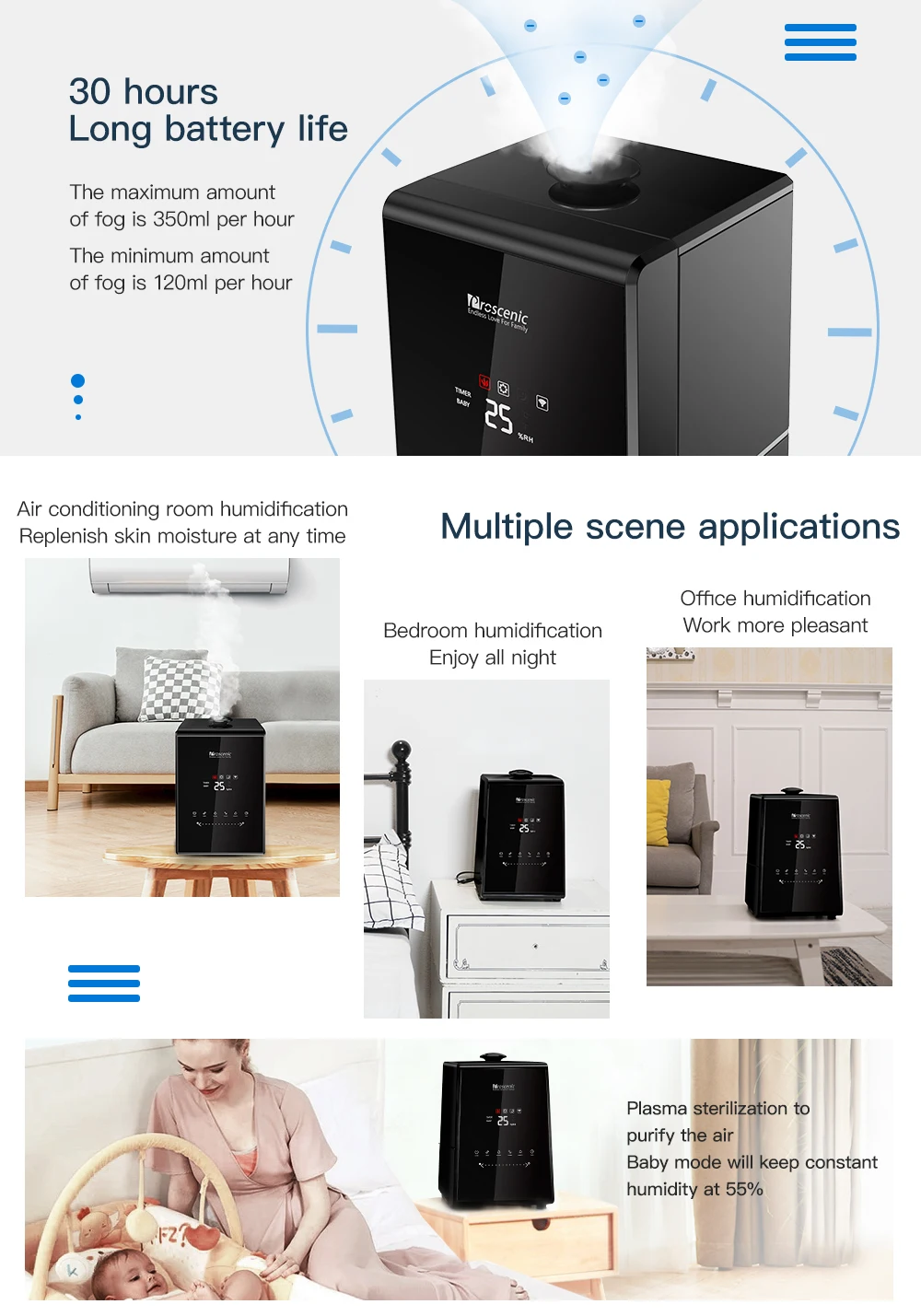 Долгое время работы: с резервуаром для воды 5,3л увлажнитель воздуха может работать до 30 часов и обеспечивает широкую поверхность тумана; Двойные вращающиеся паровые насадки на 360 ° увлажняют в любом месте комнаты.