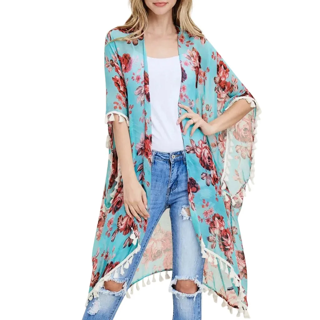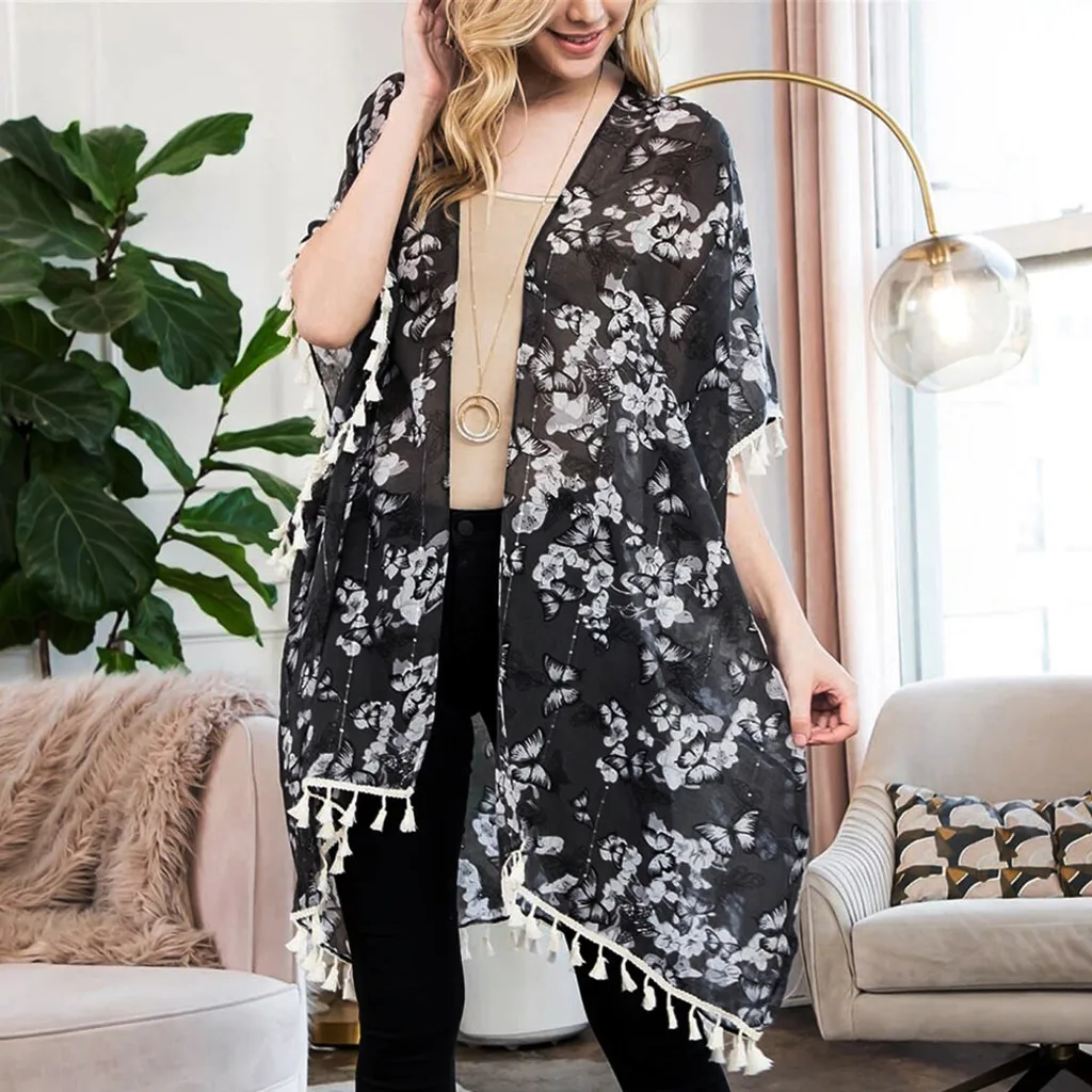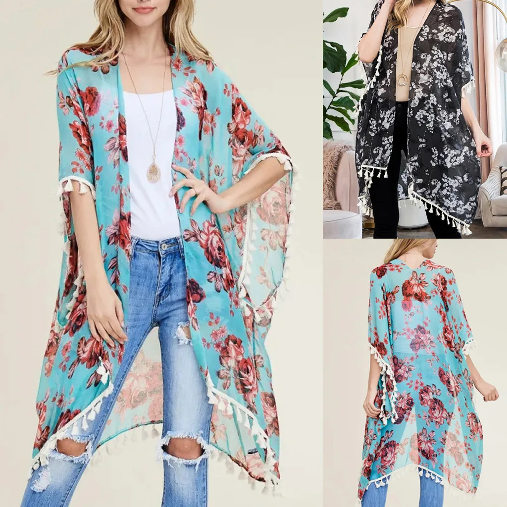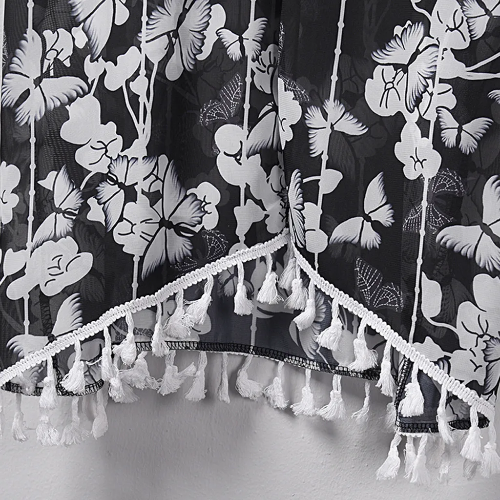 Женский модный шифоновый Повседневный Топ с принтом, Свободный кардиган накидка с кисточками