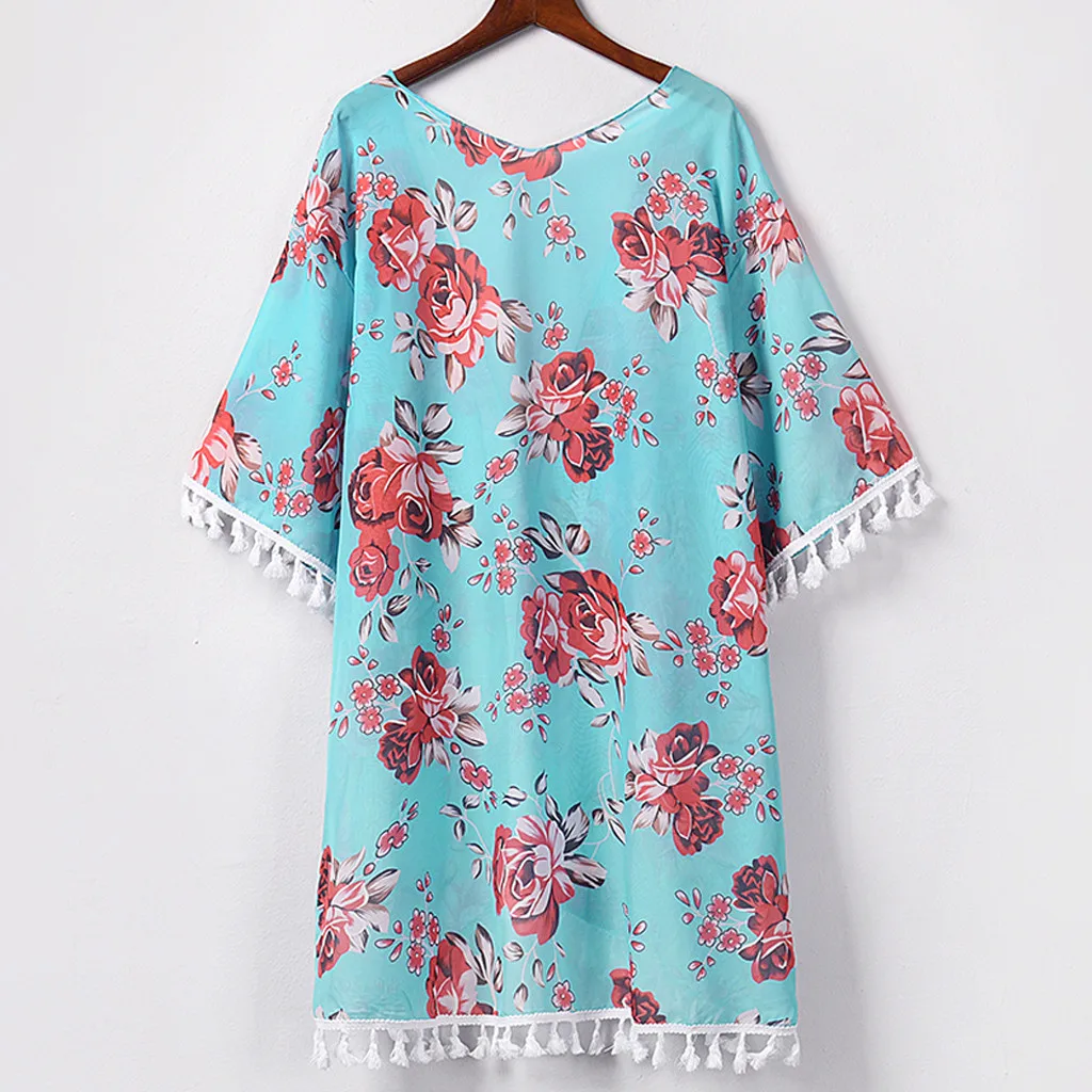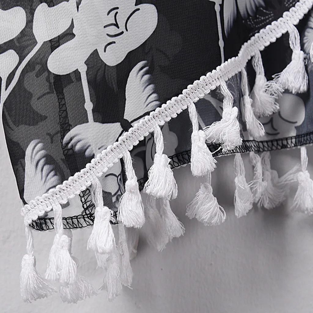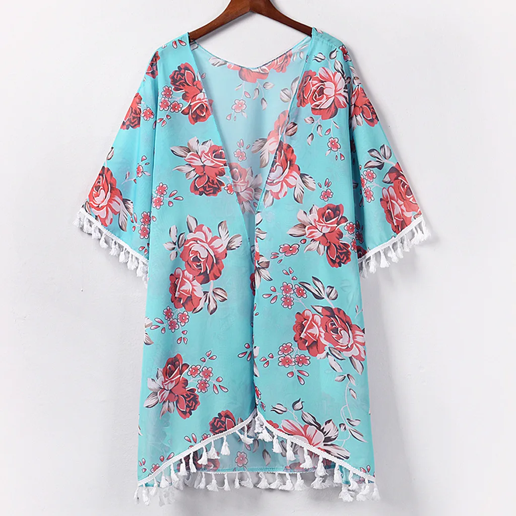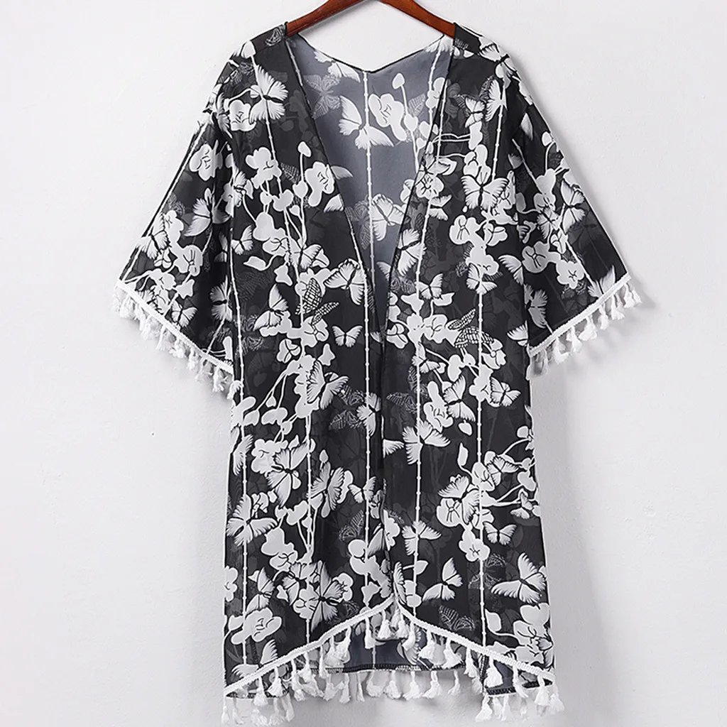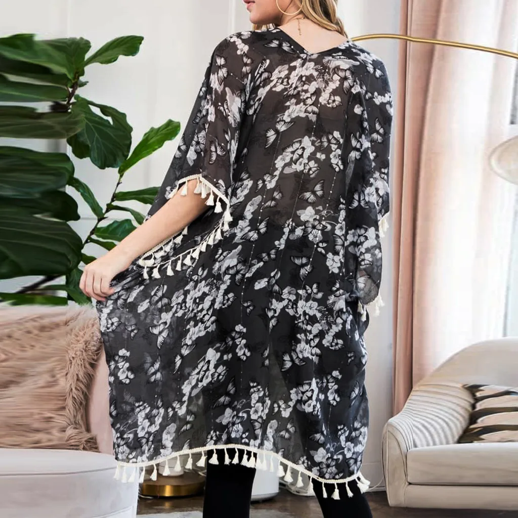 Женский модный шифоновый Повседневный Топ с принтом, Свободный кардиган накидка с кисточками