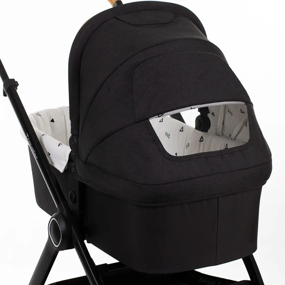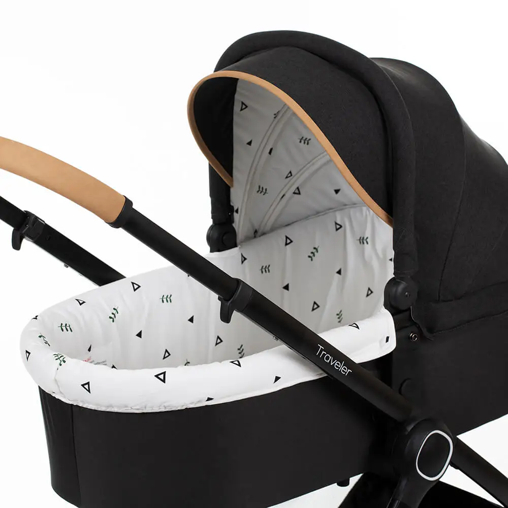 Коляска 3 в 1 Esspero Traveler– модульная коляска от норвежского бренда. Базу коляски составляет инновационное шасси из авиационного алюминия, что увеличивает показатели прочности и износостойкости продукта. Наличие амортизации и подшипников на каждом колесе повышают маневренность и проходимость транспортного средства. Передняя пара колес является поворотной и может фиксироваться в одном положении. Имеется надежная тормозная система, которая приводится в действие при помощи ноги. Ручка регулируется по высоте телескопически и покрывается мягкой и качественной эко-кожей. Вещи ребенка или покупки можно разместить в съемной тканевой корзине.