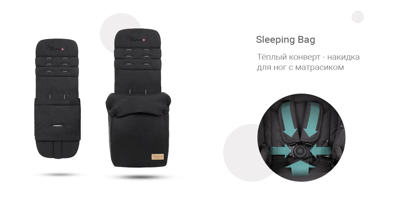 Люлька и прогулочный блок получили хорошие внутренние габариты и непродуваемое, влагоустойчивое верхнее покрытие. В обоих модулях имеются глубокие капюшоны и утепленные накидки на ножки.Внутреннее покрытие изготавливается исключительно из натуральной хлопковой ткани. Прогулочный блок может ставиться на шасси в двух направлениях движения. Он получил пятиточечные ремни безопасности с мягкими плечевыми накладками и съемный поручень с покрытием из эко-кожи. Регулировка по высоте подножки и спинки дают возможность получить комфортное спальное место для маленького пассажира.
