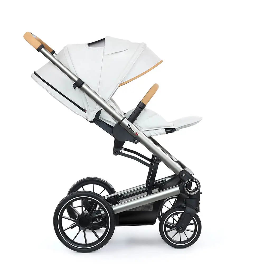 Коляска 2 в 1 Esspero Tour S– транспортная модульная система для детей от рождения и до 3-4 лет. Это горячая новинка 2020 года от норвежского бренда. Все съемные модули легко устанавливаются на единой высокопрочное шасси из качественного алюминия. База коляски складывается книгой и легко хранится или перевозится в собранном виде. Пружинная амортизация и подшипники в наличии на каждом из колес, а передняя пара является поворотной и может фиксироваться в одном положении. Надежный ножной тормоз зафиксирует коляску даже на наклонной поверхности. В нижней части шасси располагается съемная тканевая корзина для перевозки вещей ребенка или покупок.Все съемные модули имеют непродуваемое и влагоотталкивающее покрытие, глубокие капюшоны и накидку на ножки. Люлька внутри получила натуральное хлопковое покрытие. Есть регулируемый извне подголовник и система внутренней вентиляции. В капюшоне имеется встроенная москитная сетка для жаркого времени года. Реверсивный прогулочный блок оснащается пятиточечными ремнями безопасности. Они имеют мягкие плечевые накладки. Съемный поручень покрыт мягкой эко-кожей. Спинка имеет несколько фиксированных положений по углу наклона, а подножка регулируется по высоте.Данная коляска дополнительно может оснащаться сумкой для мамы (необходимо докупить отдельно или выбрать полную комплектацию сразу). Она имеет возможность крепиться за ручку коляски и поможет содержать все необходимые аксессуары малыша в одном удобном месте.Люлька: