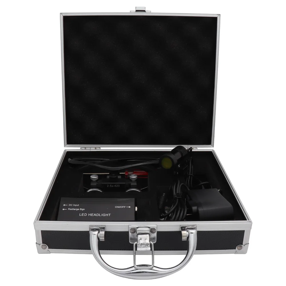 Спецификация: Увеличение: 2,5x Рабочее расстояние: 420 мм Глубина поля: 80 мм Поле зрения: 60 мм Рамки: сплав Ni или титан Особенности: Светодиодный светильник: 5 Вт Непрерывное время работы: после полной зарядки 5 ч Время работы лампы: 10000 ч Аккумулятор: перезаряжаемый литий-ионный аккумулятор Яркость: регулируемая Входное напряжение: AC100-240V / 50-60 Гц "
