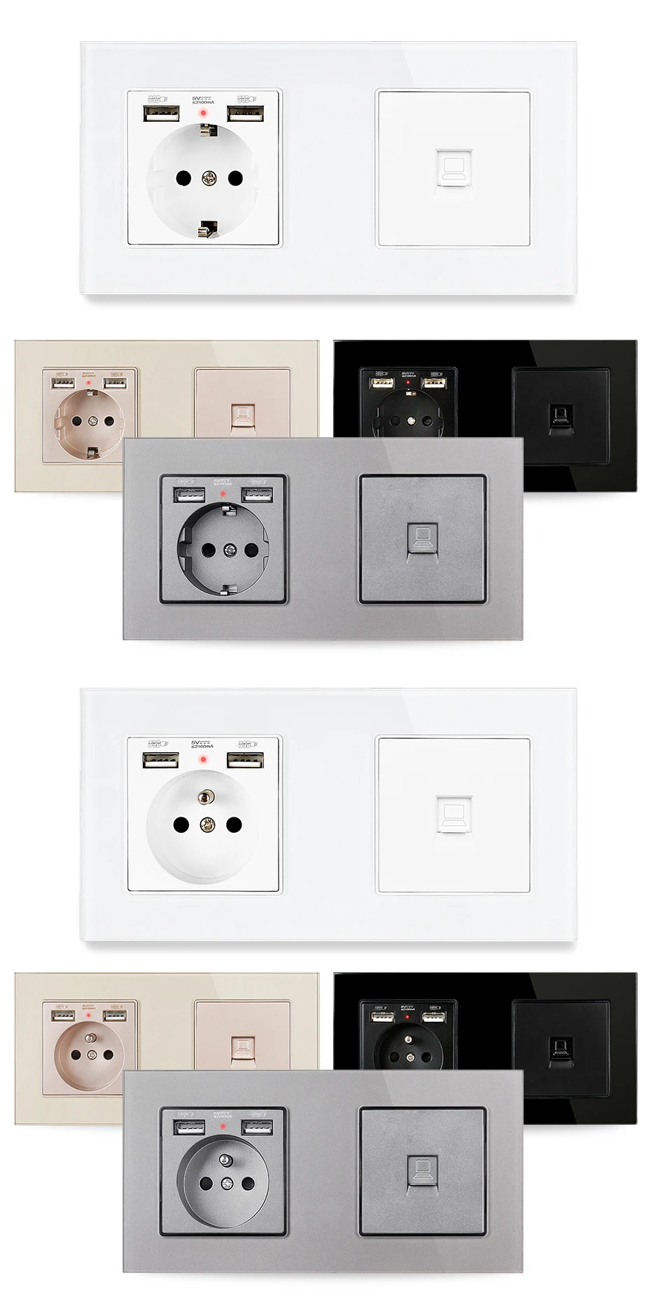 UNKAS стеклянная панель, ЕС, французский стандарт, настенная розетка с двойным usb-портом для зарядки + разъем RJ45 для интернет-компьютера 258 мм * 86 мм