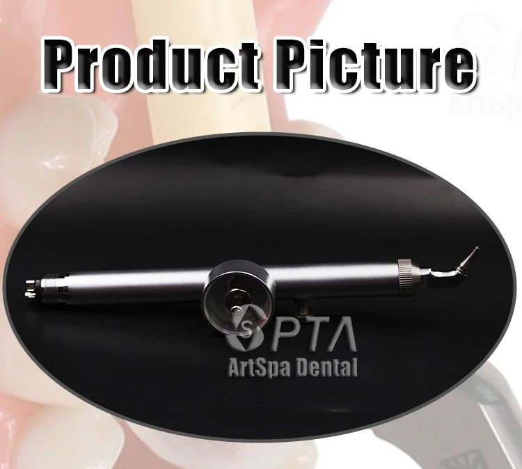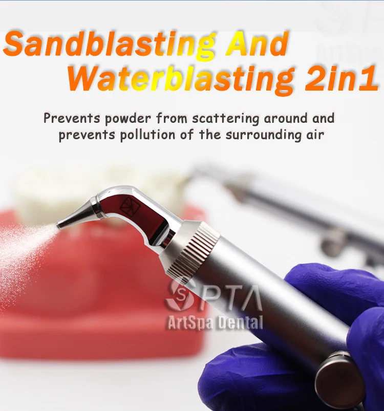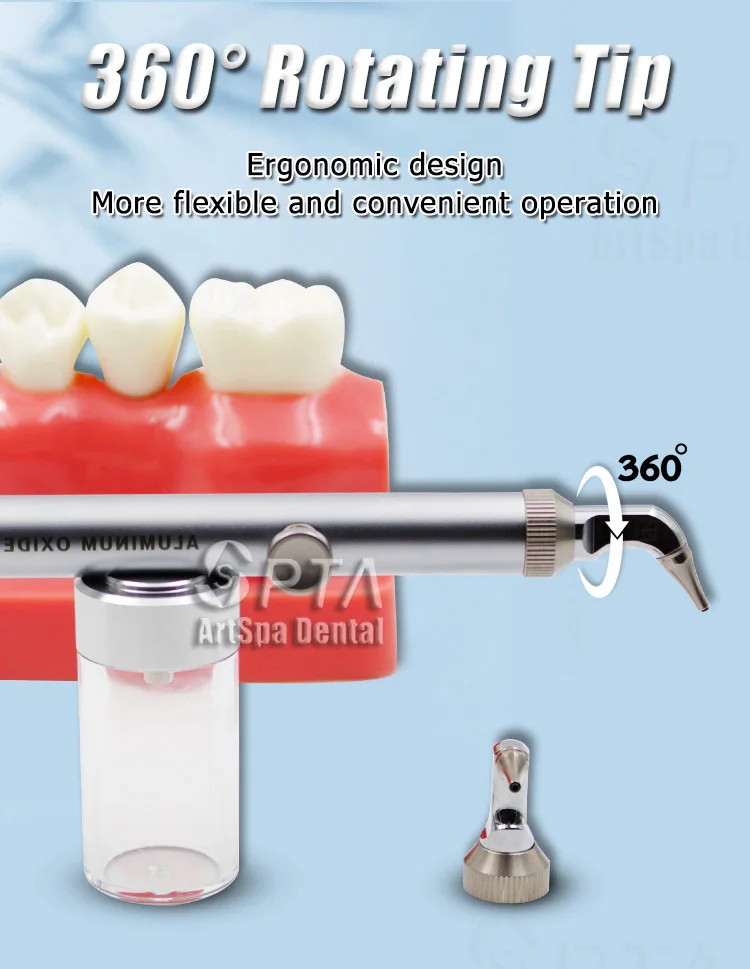 The cooling system prevents the powder flying around and contaminating the surrounding air. The ergonomically designed 360-degree rotary head operation is more flexible and convenient, hand-controlled button operation is more safer. With anti-suction function, prevent sand powder from sucking back into the dental chair water vapor system. It can be sterilized at of 135 degrees to prevent cross-infection. Connect directly to the dental chair handpiece hose to save time. Aluminum oxide powder is mainly used for surface cleaning and microcoarsening before bonding; The surface roughening of the whole porcelain and metal repairies;The bottom of the net such as the orthodontic hook bond before coarsening, the secondary debonding agent to remove the maximum increase in adhesion force. The use of sodium bicarbonate powder can eliminate cigarette stains on the surface of the tooth, food residues can also remove plaque and pigment spots in the tooth space In order to resist the accumulation of antimicrobial plaque, block the formation of dentition, and prevent periodontal disease. At the same time, it can increase the brightness and whiteness of the teeth themselves.It makes your teeth look good and beautiful.