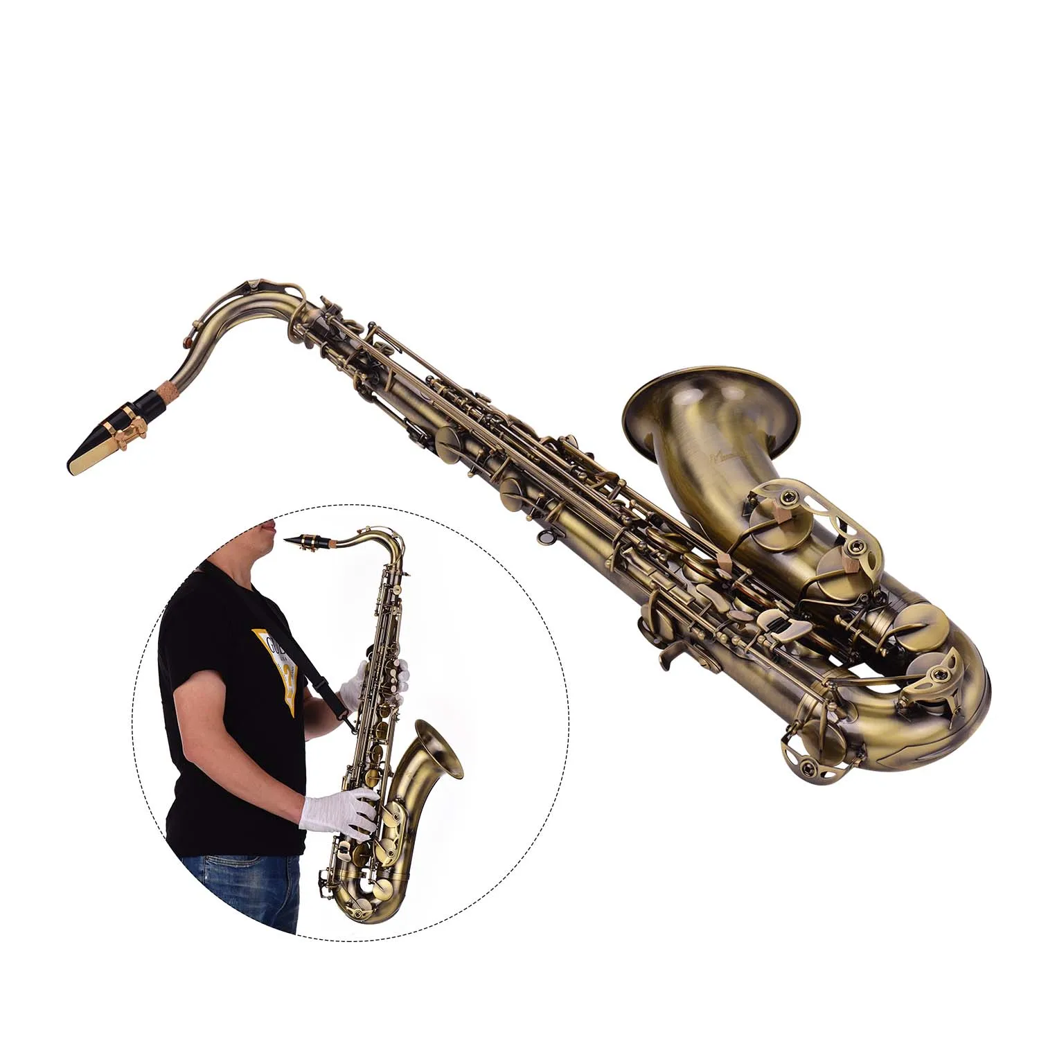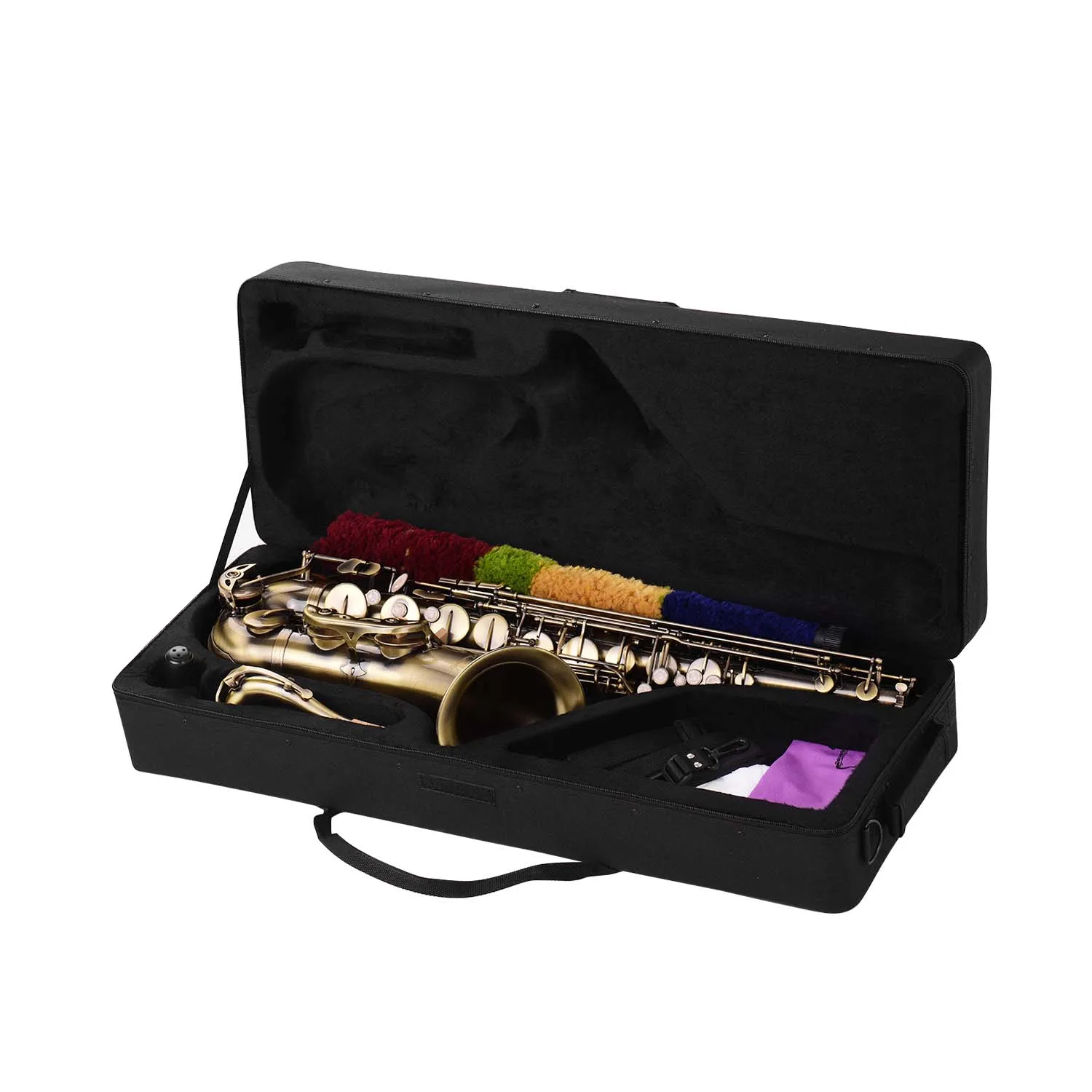 Богатые и практичные аксессуары --Мягкий чехол с ручкой и плечевым ремнем используется для удобного хранения и переноски саксофона; Ремешок на шею и перчатки sax делают вашу работу более легкой и профессиональной; И Чистящая ткань и Чистящая Щетка предназначены для ежедневного поддержания саксофона.