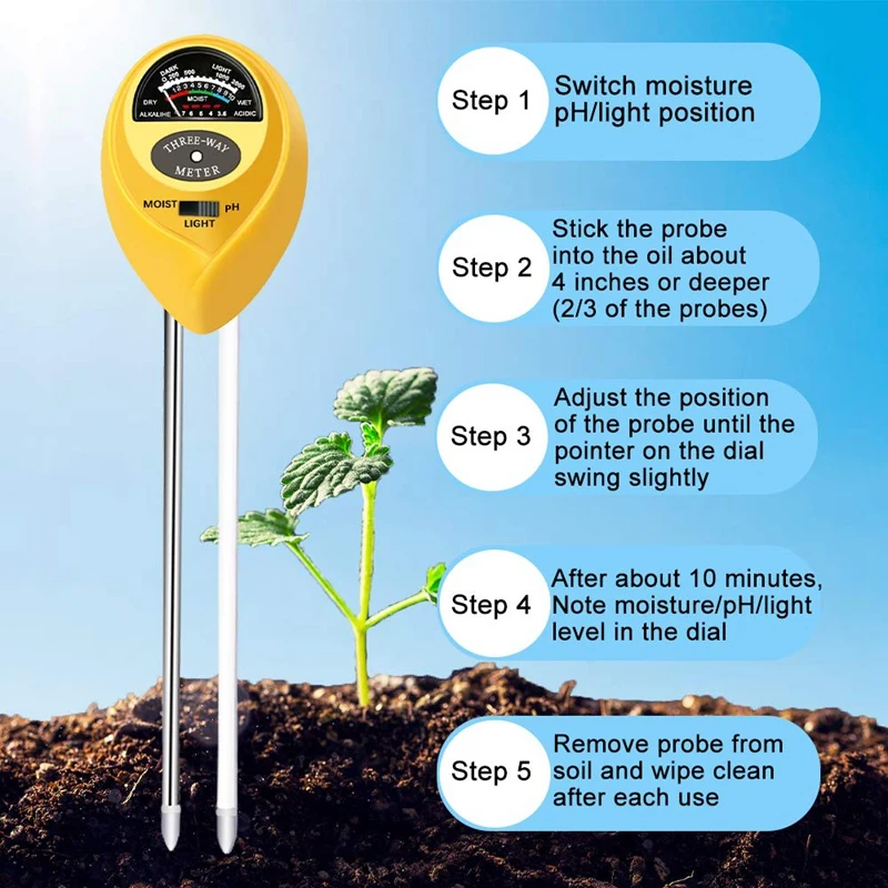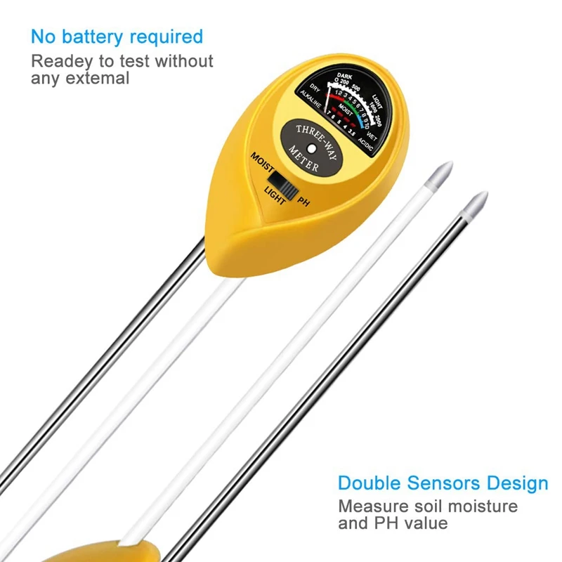 Функции 3-в-1: вы можете измерить влажность почвы, значение pH и интенсивность солнечного света. Это полезно для вас, чтобы растить цветы, растения и сделать их здоровыми и сильными