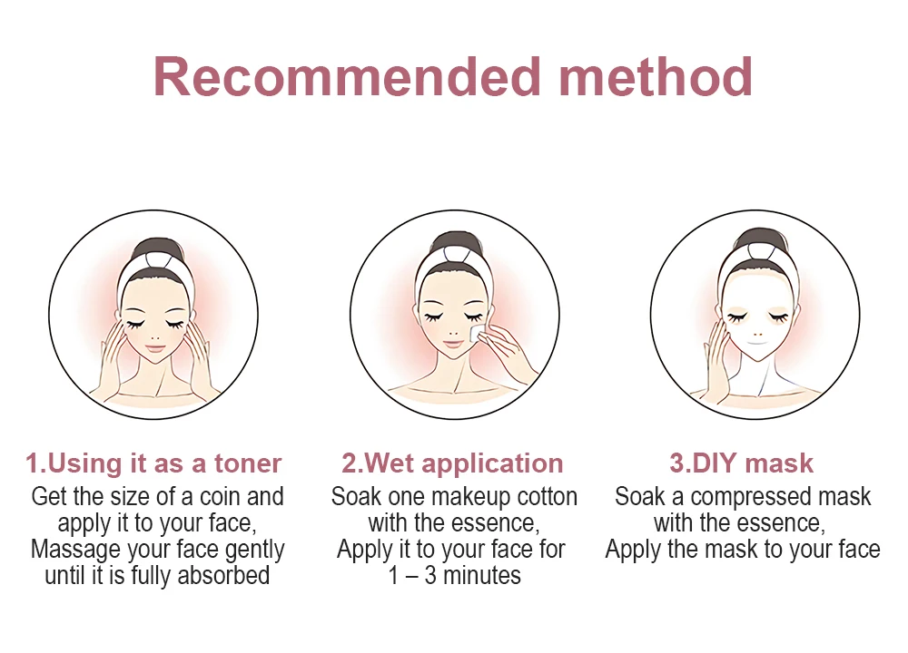 1. Использование в качестве тонера Получите размер монеты и нанесите ее на лицо, мягко массируйте лицо до полного впитывания. 2. Влажное нанесение Замочите один макияж из хлопка с эссенцией, нанесите его на лицо в течение 1-3 минут. 3. DIY маска Замочите сжатую маску эссенцией, нанесите маску на лицо.