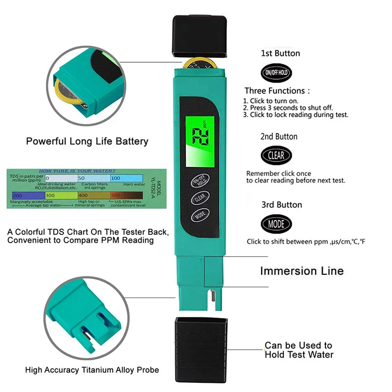 Широкое использование: проверка чистоты питьевой воды для обеспечения ее здоровья, мониторинг, если система обратного осмоса (RO)/DI работает должным образом, необходимо ли заменить фильтр, обслуживание аквариума, гидропоники (тест питательных веществ), бассейн и спа и т. Д.