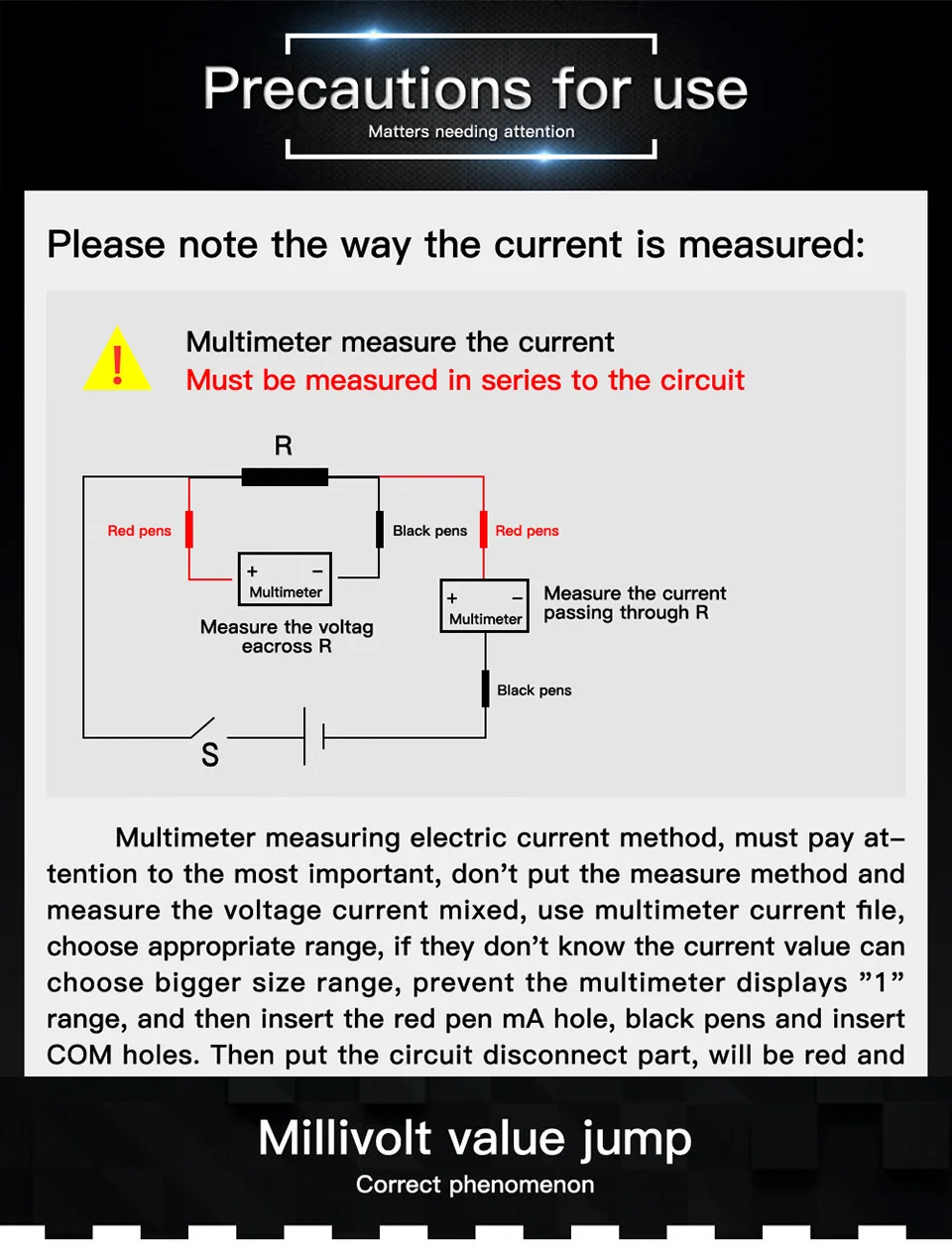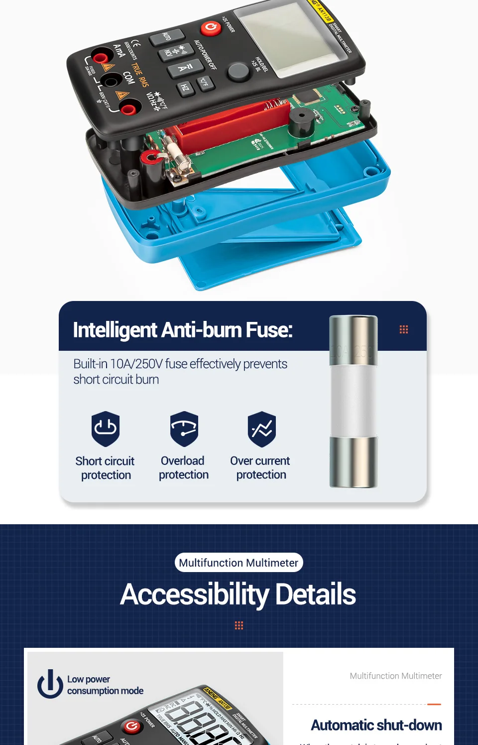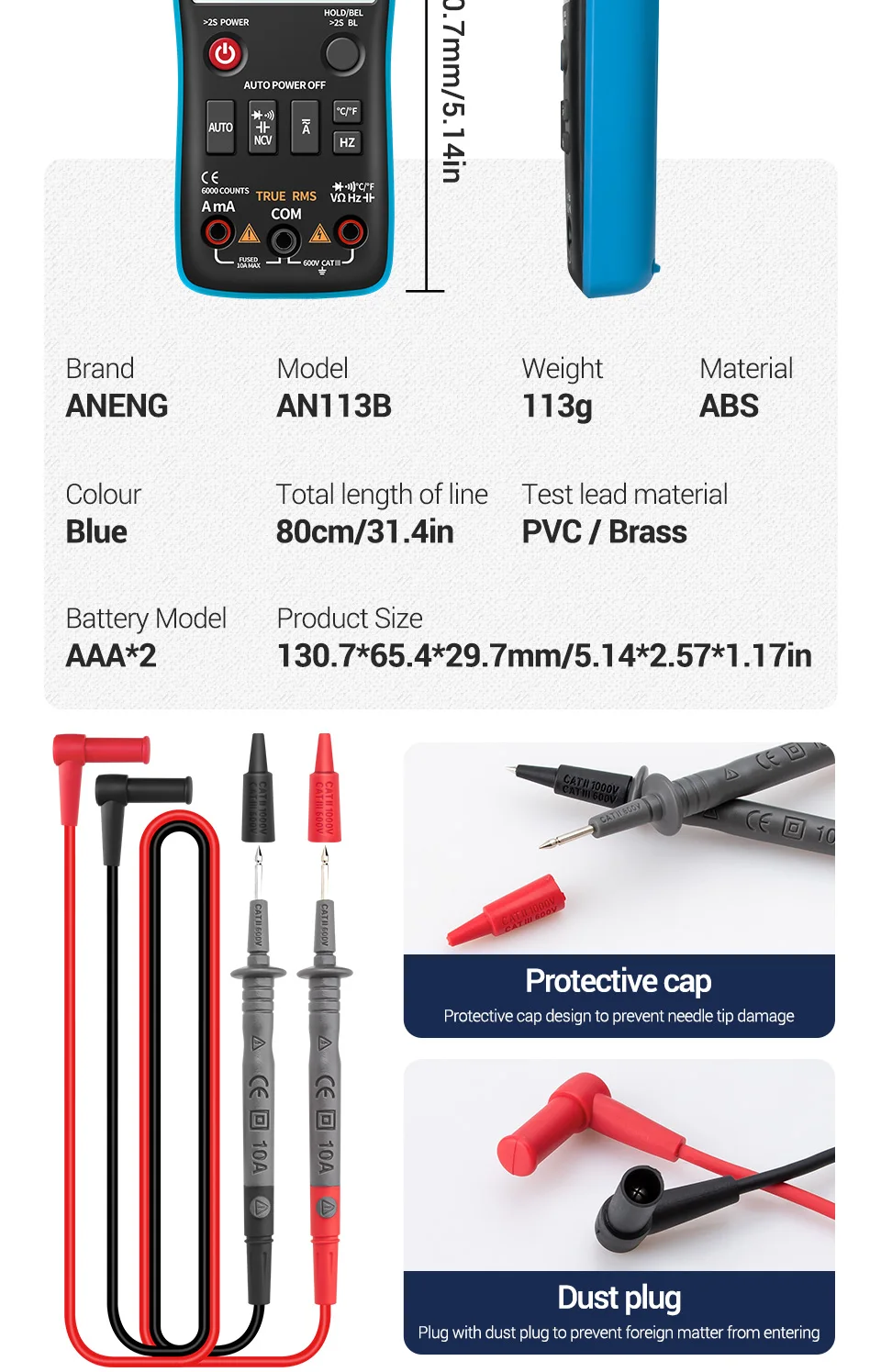 Технические характеристики Бренд Анэн Модель AN113B Дисплей 6000 штук Диапазон Авто Материал АБС-пластик Скорость обновления 3 раза/секунду True RMS Да REL Да Хранение данных Да Подсветка Да Автоматическое отключение питания Да Индикация низкого заряда батареи Да Операционная система Температура: 0 ~ 40 ℃ Хранение Температура:-20 ~ 60 ℃ Влажность:<75% Влажность:<80% Функция Диапазон Разрешение Макс. Напряжение постоянного тока 6 в/60 в/600 В 0,001 в/0,01 В/0,1 В 600,0 в Напряжение переменного тока 6 в/60 в/600 В 0,001 в/0,01 В/0,1 В 600,0 в Постоянный ток 999.9 мА/9.999A 0. 1мА/0.001а 9.999A Ток переменного тока 999.9 мА/9.999A 0. 1мА/0.001а 9.999A Сопротивление (omh) 600/6k/60k/600k/6M/60M 0,1/0,001 k/0,01 K/0,001 M/0,01 M 60,00 м Емкость 6nF/60nF/600nF/6 мкФ/60 мкФ/600 мкФ/6mF/60mF - 60.00mF Частота (Гц) 6/60/600/6k/60k/600k/6M/10M - 10,00 МГц Температура -30 ~ 1000 ℃(-22 ~ 1832 ℃) Диод Да Непрерывность Да NCV Да Звуковой сигнал on-off Да Обнаружение фазы Да Аккумулятор 2 * AAA (без) Вес Около 115 г Размер Около 130*65*29 мм Цвет Красный/черный/синий/оранжевый