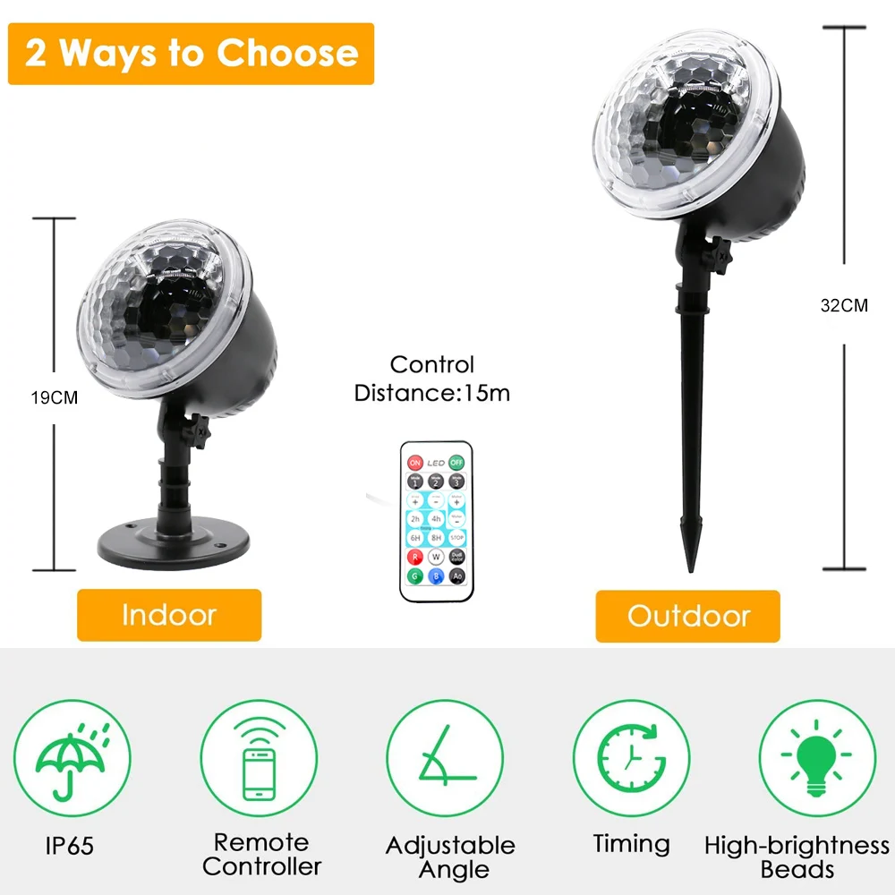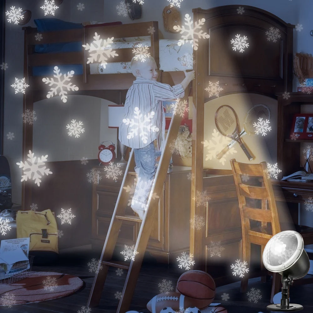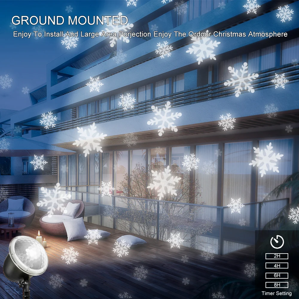 * Большая площадь проекции: светильник проектора может очень хорошо покрыть ваш дом. Лучшее расстояние проекции составляет 10 метров (32 фута), а самое дальнее расстояние-15 метров (49 футов). Просто установите светильник снаружи и включите его, вы можете увидеть, как снежинки падают с неба, что делает ваш дом более красивым.
