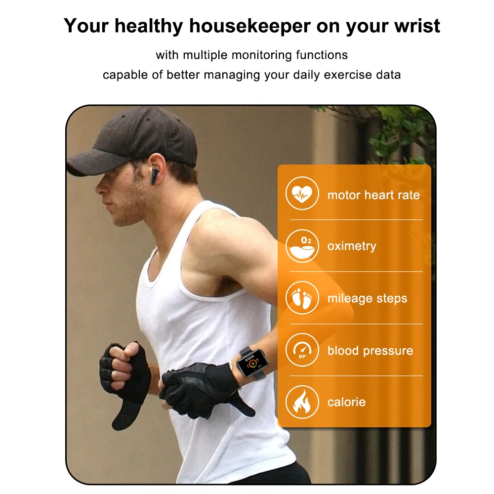 Функции: калории, пульт дистанционного управления камерой, BT вызов, BT музыкальный плеер, синхронизация времени, история вызовов, анти-потеря, повторный набор, монитор сна, шаги, сердечный ритм, BT гарнитура, артериальное давление, будильник, информационные уведомления...