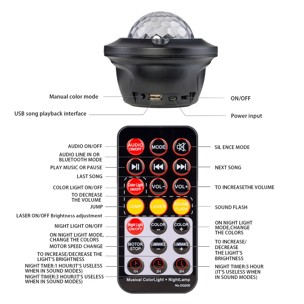 Лампа для проектора RGB удобна в управлении и использовании, вы можете легко переключать режимы, регулировать музыку и устанавливать таймер