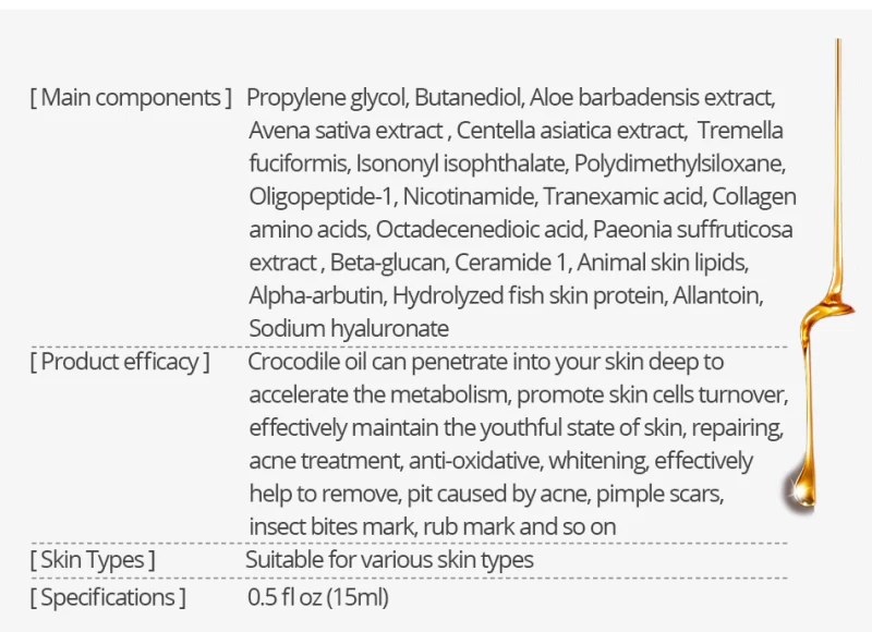 Крокодиловое масло может проникать в вашу кожу глубоко, чтобы ускорить метаболизм, продвигать клетки кожи, эффективно поддерживать молодость кожи, восстанавливать лечение акне, антиоксидантное, отбеливание эффективно помогает удалить, яма, вызванная акне, шрамами прыщей, отметками укусов насекомых, отметками и т. д.