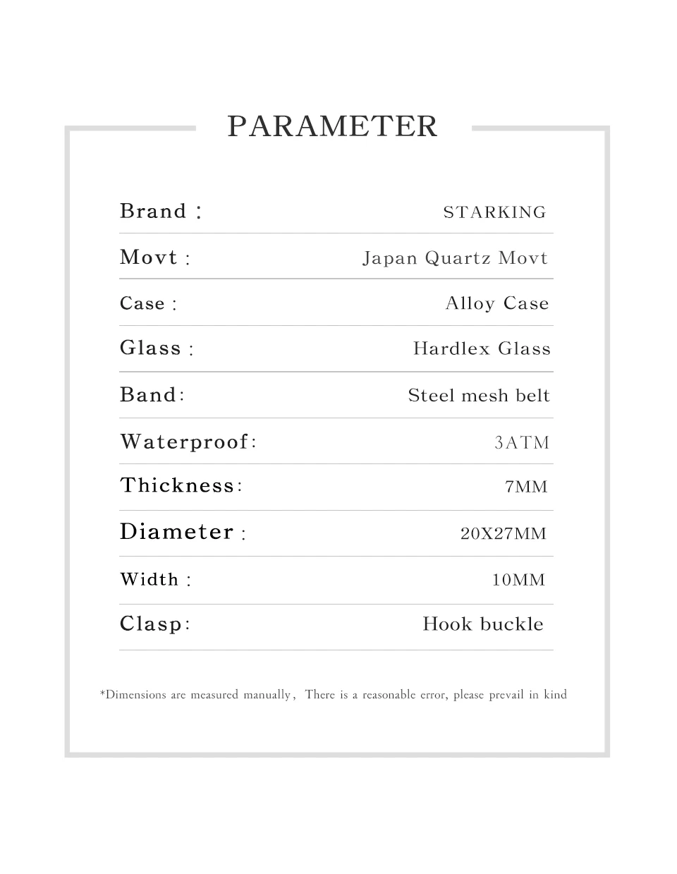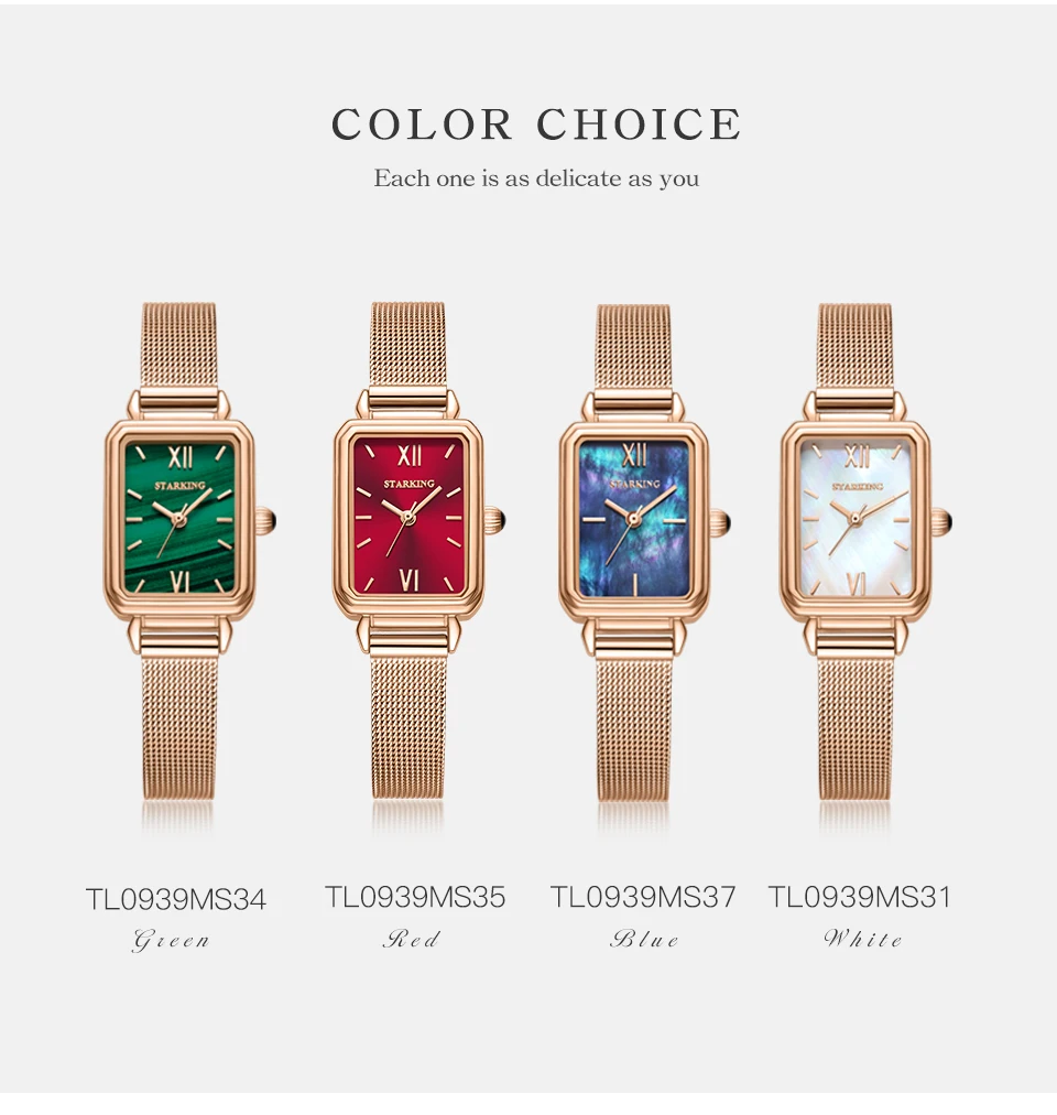 -Торговая марка: STARKING -Стиль: уникальные прямоугольные часы -Hardlex Стекло циферблат -Сплав часы Чехол -Дисплей: аналоговый -Ремешок для часов: сетчатый ремешок milanese -Механизм: импорт японского кварца -Водонепроницаемый возможностью погружения на глубину до 30 м 12 месяцев гарантии
