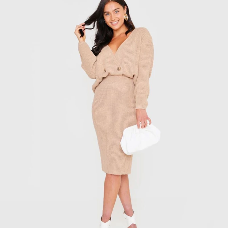 ОписаниеЖенское платье с длинным рукавом трикотажные укороченные топы и юбки костюм комплект нижнего белья 2020 осень комплект из двух предметов для женщин свитер + юбка-карандаш, костюм