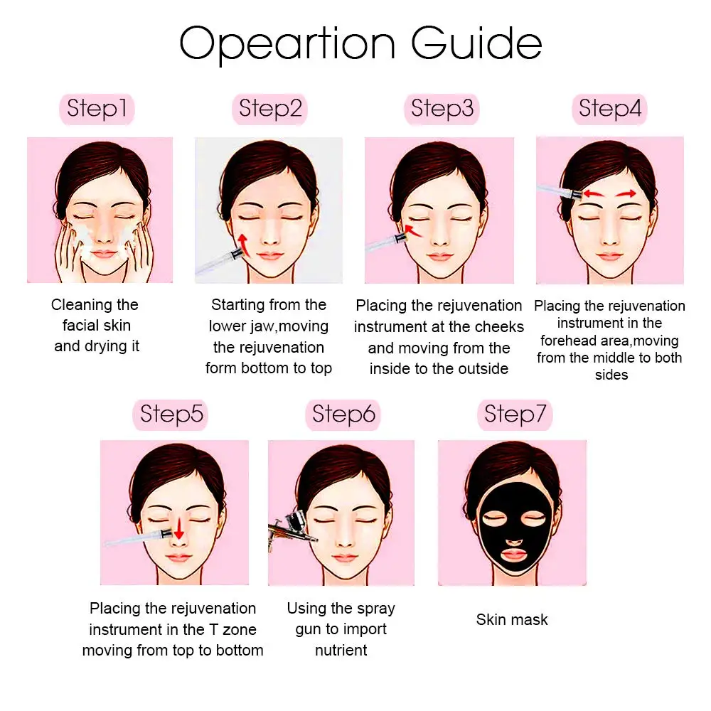 1. Сначала очистите лицо, затем нанесите немного геля для ухода за кожей на лицо и мягко массируйте. 2. После массажа лица, очистите лицо чистой водой. 3. Включите устройство и выберите функцию отшелушивания для отшелушивания области лица около 10 минут. После этого Наденьте маску для лица для ухода и обновления кожи. 4. Добавьте эссенцию лосьона в водную камеру распылителя, затем включите распыляющий пистолет и закройте глаза.