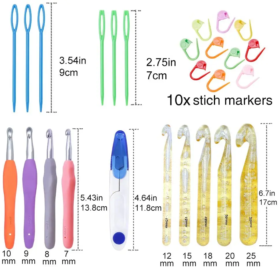 1. Набор крючков для вязания крючком содержит много полезных принадлежностей для вязания крючком, таких как маркеры для стежков, пластиковые швейные иглы и ножницы для пряжи. 2. Большие иглы для шитья глаз хороши для работы с вязальной нитью, чтобы вплести хвосты в швы, маркер для стежков изготовлен из высококачественного пластика, мягкий, гибкий, прочный и легко сгибаемый, но никогда не вырывается. 3. Быстрая блокировка и простота в использовании. Хорошо подходит для нанесения стежков, не выскальзывает и не затягивает Вязание.