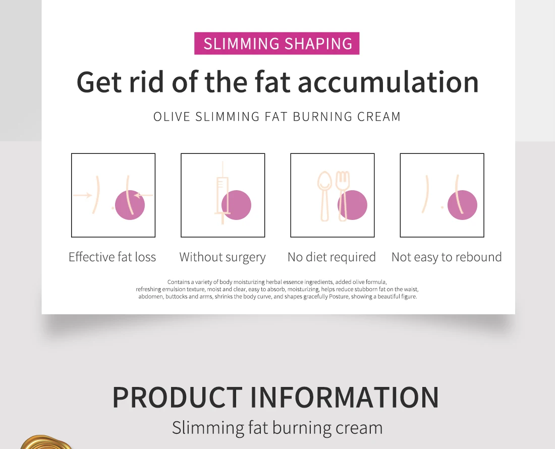 Этот продукт содержит различные увлажняющие растительные эссенции для тела, добавляя оливковую формулу, которая делает эмульсию свежей, блестящей и чистой, легко впитывает и увлажняет, это поможет вам уменьшить упрямый жир в талии, животе, бедрах и руках. В то же время, уменьшите изгиб вашего тела, создайте замечательную осанку, подарите красивую фигуру.
