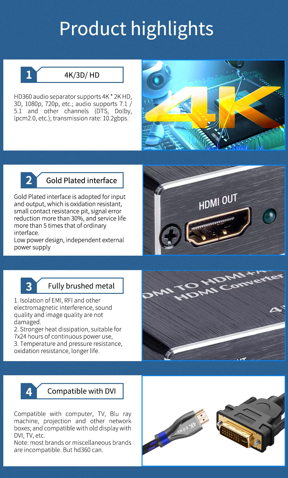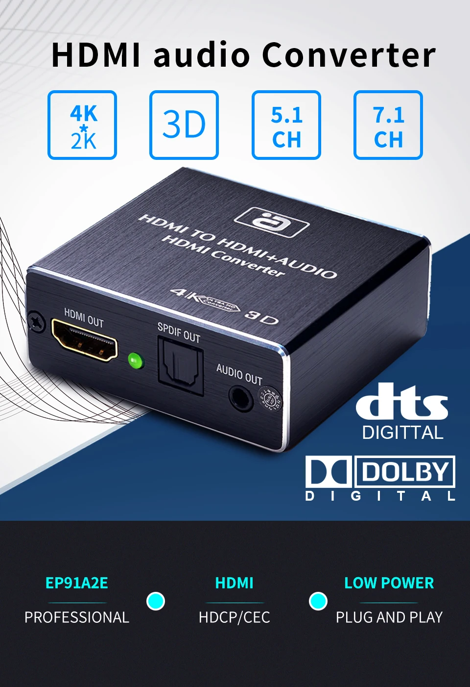 Этот, совместимому с HDMI аудио конвертер может извлечь звуковой сигнал, встроенный в HDMI источников и преобразуйте ее до 3,5 мм аналоговый аудио выход и SPDIF выход в одно и то же время. SPDIF out поддерживает 2 CH аудио и 5,1 CH аудио, включая Dolby Digital 5,1 CH и DTS 5,1 CH. HDMI out поддерживает аудио 7,1 CH, включая Dolby Digital 7,1 CH и DTS 7,1 CH. Ультра Дальняя передача до 40 метров (вход + выход), без потери сигнала. 99% не нуждаются в внешнем источнике питания, подключи и работай, более удобные, экологически чистые. Особенности: • Входные порты: 1 x HDMI, 1 x Micro USB порт питания, 3 x EDID аудио (pass, 2 CH, 5,1 CH) • Выход порты: 1 HDMI, 1 х SPDIF (оптический кабель) 1x3,5 мм jack. • HDMI разрешение: 4K x 2K, 24/50/60/1080P/1080i/720p/576p/576i/480p/480i • Поддерживаемые цветовые форматы: 24 бит/глубокий цвет 30 бит, 36 бит • Максимальная пропускная способность: 225 МГц • Максимальная скорость передачи данных: 6,75 Гбит/с • Максимальный рабочий ток: 190 мА • Аудио и видео могут быть преобразованы из HDMI-совместимого выхода • Передача: Поддержка выхода 7,1 каналов, устройство считывает аудио сигнал HDMI • 2CH: 2,1 выход стереозвука • 5.1CH: оптическое волокно 5,1 цифровое объемное аудио (DTS, Dolby, AC3) и другие выходы; Поддержка 24 бит/192 кГц Аудио Частота дискретизации Упаковка: 1 х аудио конвертер 1 X оптический аудио кабель 1X3,5 мм РСК аудио кабель 1 кабель micro USB Предупреждения: • Продукт не изменяет формат аудио, Просто предоставьте сигнал для устройства, подключенного к HDMI, чтобы автоматически определить, какой формат аудиовыхода по этому каналу. • Устройство не поддерживает Dolby Digital Plus audio. Поддерживает DTS audio и Dolby Digital audio. • Для устройств с маломощными портами HDMI или более 15 м для питания устройства может использоваться телефонный адаптер 5 В/1 А. • Устройство не поддерживает защищенную авторским правом информацию.