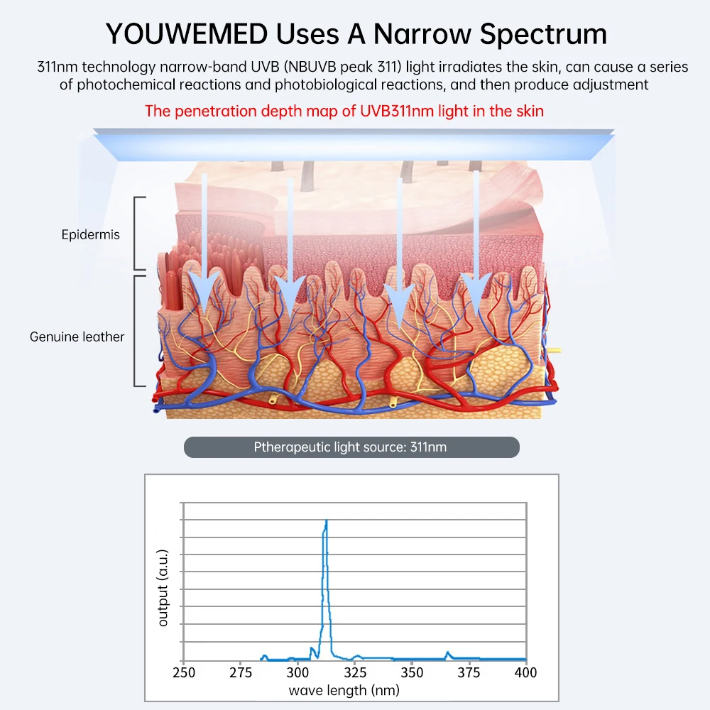 1.YOUWEMED использует узкий спектр 311nm технологии Узкополосный UVB (NBUVB пик 311) светильник облучает кожу, может вызвать ряд фотохимических реакций и фотобиологических реакций, а затем произвести регулировку 2.YOUWEMED UVB фототерапия инструмент. Адъювантное лечение витилиго и псориаза Светильник Philips, домашний портативный, экономия затрат 3. Интеллектуальное управление, одна кнопка синхронизации, он может установить время лечения и остановить автоматически после лечения, не повреждая кожу 4. Медицинская Сертификация Международная сертификация CE Знак "CE"-это знак сертификации безопасности, который является обязательным знаком сертификации для рынка ЕС