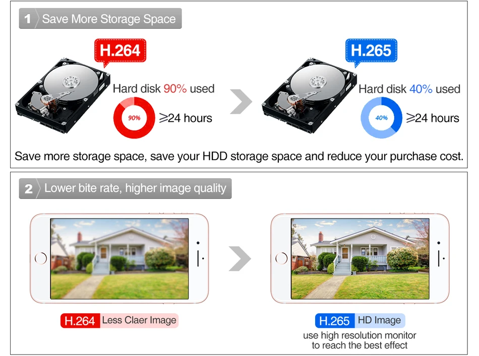 H.265 более четкий, HD разрешение предлагает вам лучшее качество изображения в более низкой скорости. Экономьте больше места для хранения, вы можете уменьшить размер файлов 40%-50%, сэкономить место для хранения HDD и снизить стоимость покупки.