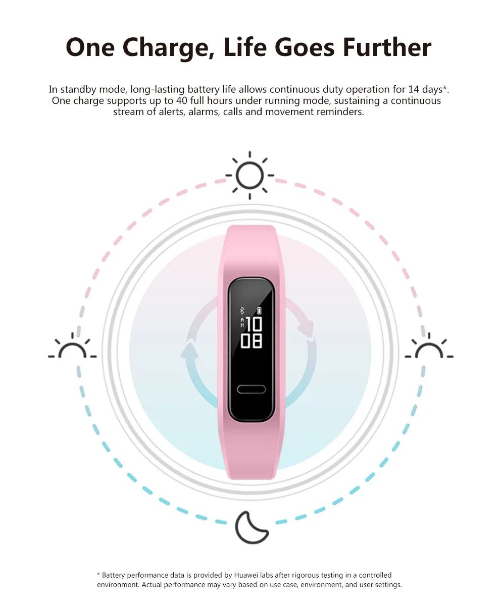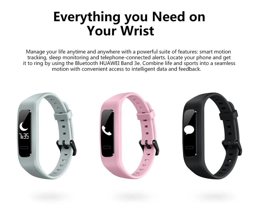 Управляйте своей жизнью в любое время и в любом месте с помощью мощного набора функций; Интеллектуальное отслеживание движения, мониторинг сна и оповещения по телефону. Найдите свой телефон и получите его к кольцу с помощью Bluetooth HUAWEI Band3e. Сочетайте жизнь и спорт в плавное движение с удобным доступом к интеллектуальным данным и обратной связи.