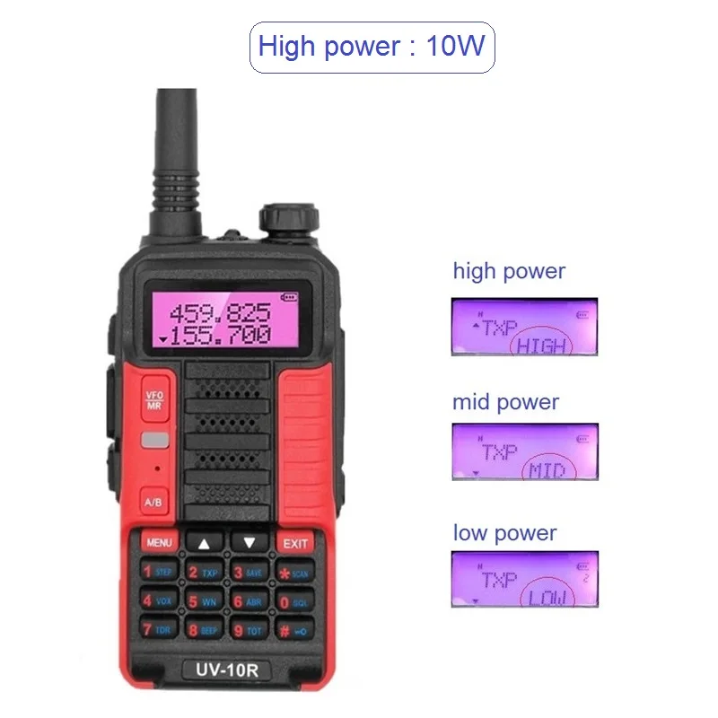 Посылка включает в себя: 1 X UV-10R Аккумулятор-1 шт. 1 X Антенна Зарядное устройство-1 шт. 1 X ремень и зажим 1 х Руководство Функции: Fm-радио приемник (65-108 МГц) DTMF кодированный 105 DCS и 50 CTCSS Функция VOX Функция сигнализации 128 каналов памяти Широкополосный (широкий)/Узкий (узкий) Подсветка дисплея и программируемая клавиатура Офсетная функция TOT Выбор режима сканирования Функция блокировки напряженного канала Встроенный RX CTCSS/DCS сканирование Встроенный светодиодный фонарик Тональный конец передачи Встроенный замок для ключей