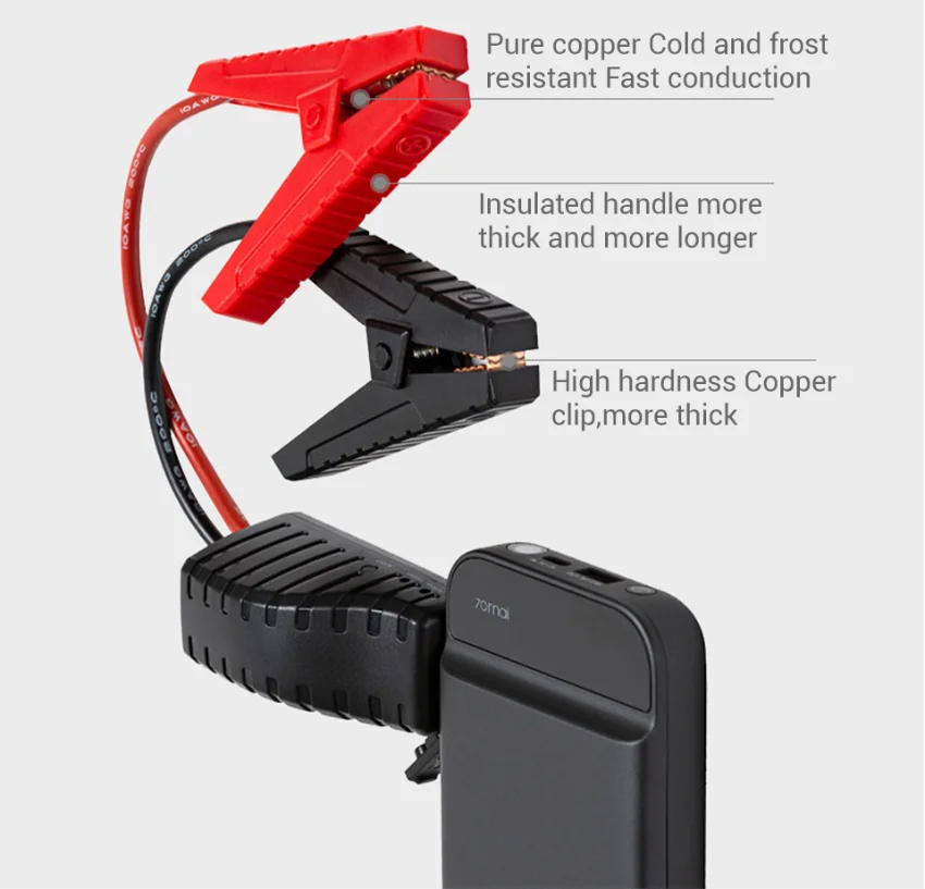 Как использовать пусковое устройство 70mai? Использование устройства в качестве стартера 12 В 1. Подключите стартер к устройству. Убедитесь, что индикатор на зажимах батареи выключен. 2. Правильно Подключите зажимы аккумулятора к положительным и отрицательным концам автомобильного аккумулятора. Красный зажим должен быть соединен с положительным (+) концом, а черный зажим должен быть соединен с отрицательным (-) концом. Затем следуйте инструкциям ниже: Когда зеленый светильник включен, соединение является правильным, и аккумулятор может быть запущен. Когда красный светильник включен и звуковой сигнал может быть услышан, зажимы подключены к неправильным концам. Подключите зажимы правильно и убедитесь, что зеленый светильник включен перед запуском аккумулятора. Когда зеленый светильник мигает и звуковой сигнал слышен, напряжение слишком низкое. Нажмите кнопку boost и подождите, пока зеленый светильник не прекратит мигать. Запуск аккумулятора в течение 30 секунд. Когда и зеленые, и красные огни не включены, и звуковой сигнал не может быть услышан, батарея может быть повреждена. Убедитесь, что зажимы подключены к правильным концам. Нажмите кнопку boost и подождите, пока не включится зеленый светильник. Запуск аккумулятора в течение 30 секунд. 3. После запуска автомобиля снимите зажимы аккумулятора.