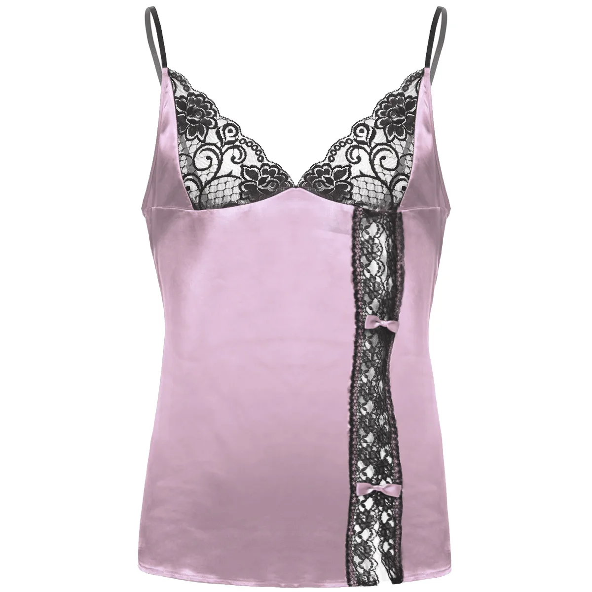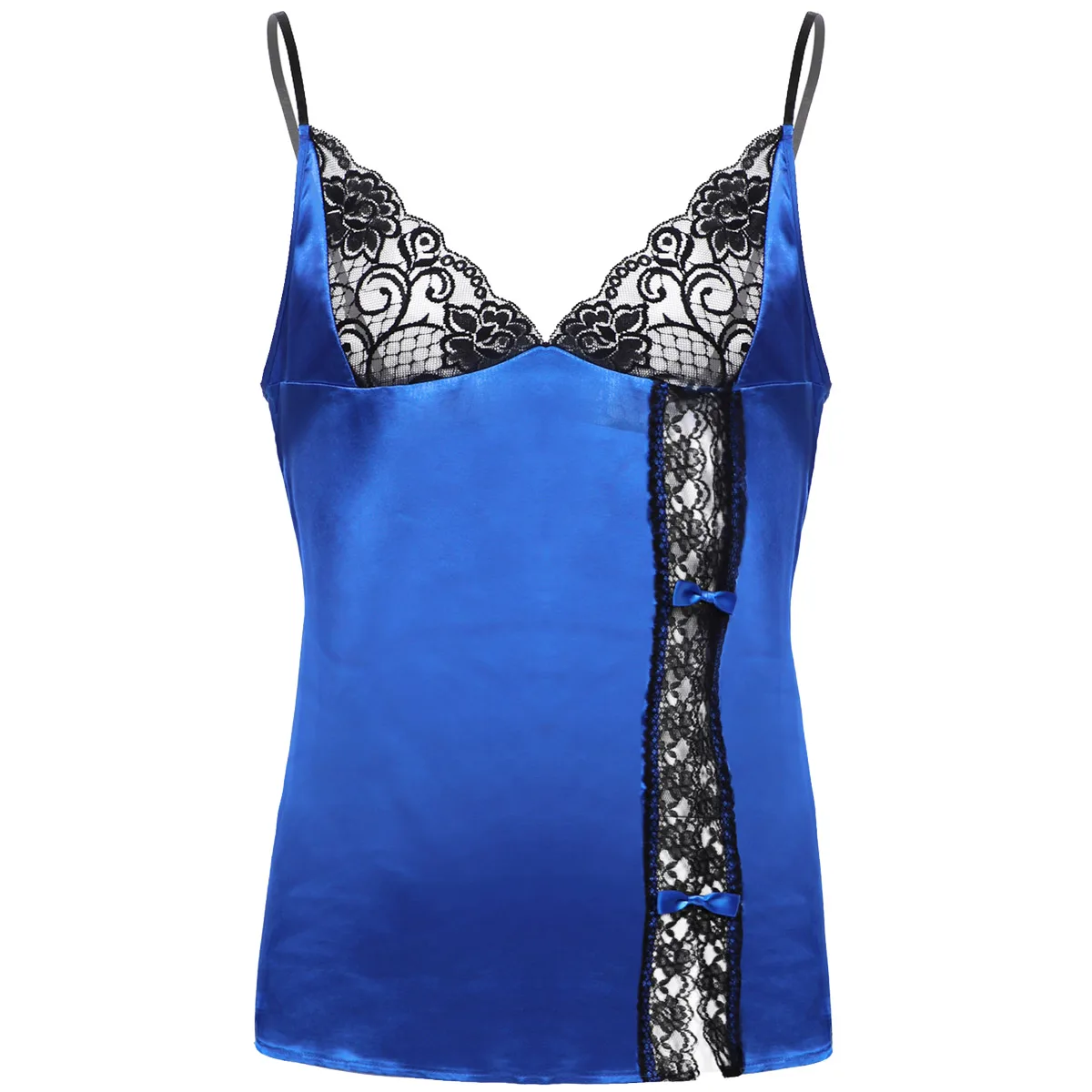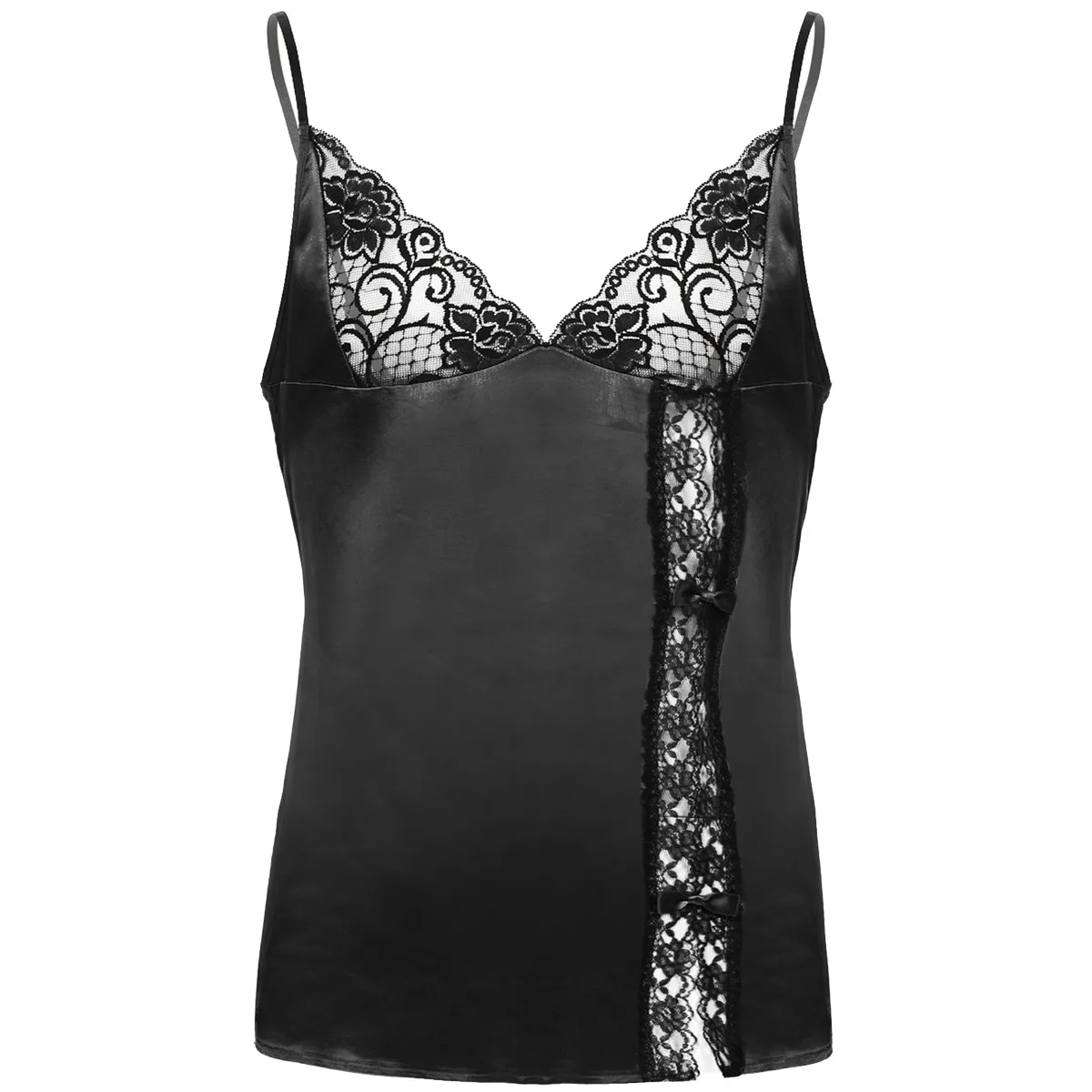 Регулируемые бретельки-спагетти и глубокий v-образный вырез, боковая расцветка с кружевной отделкой и бантиками.
