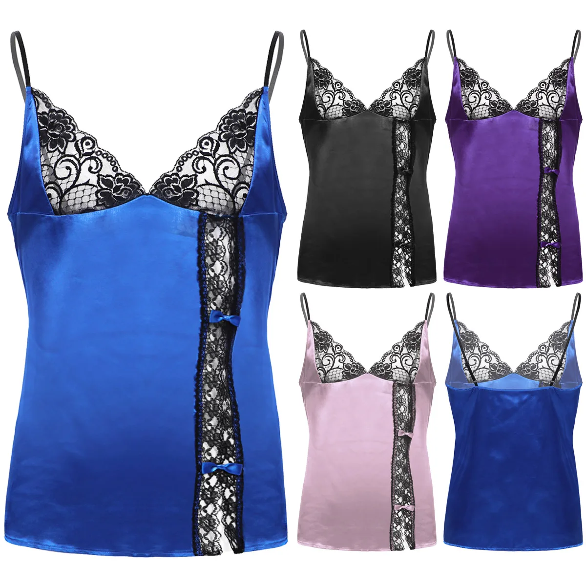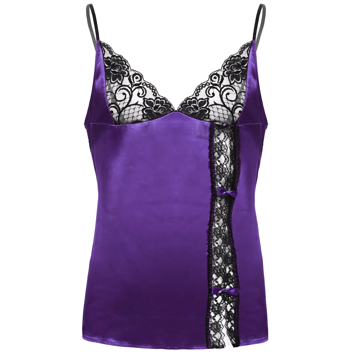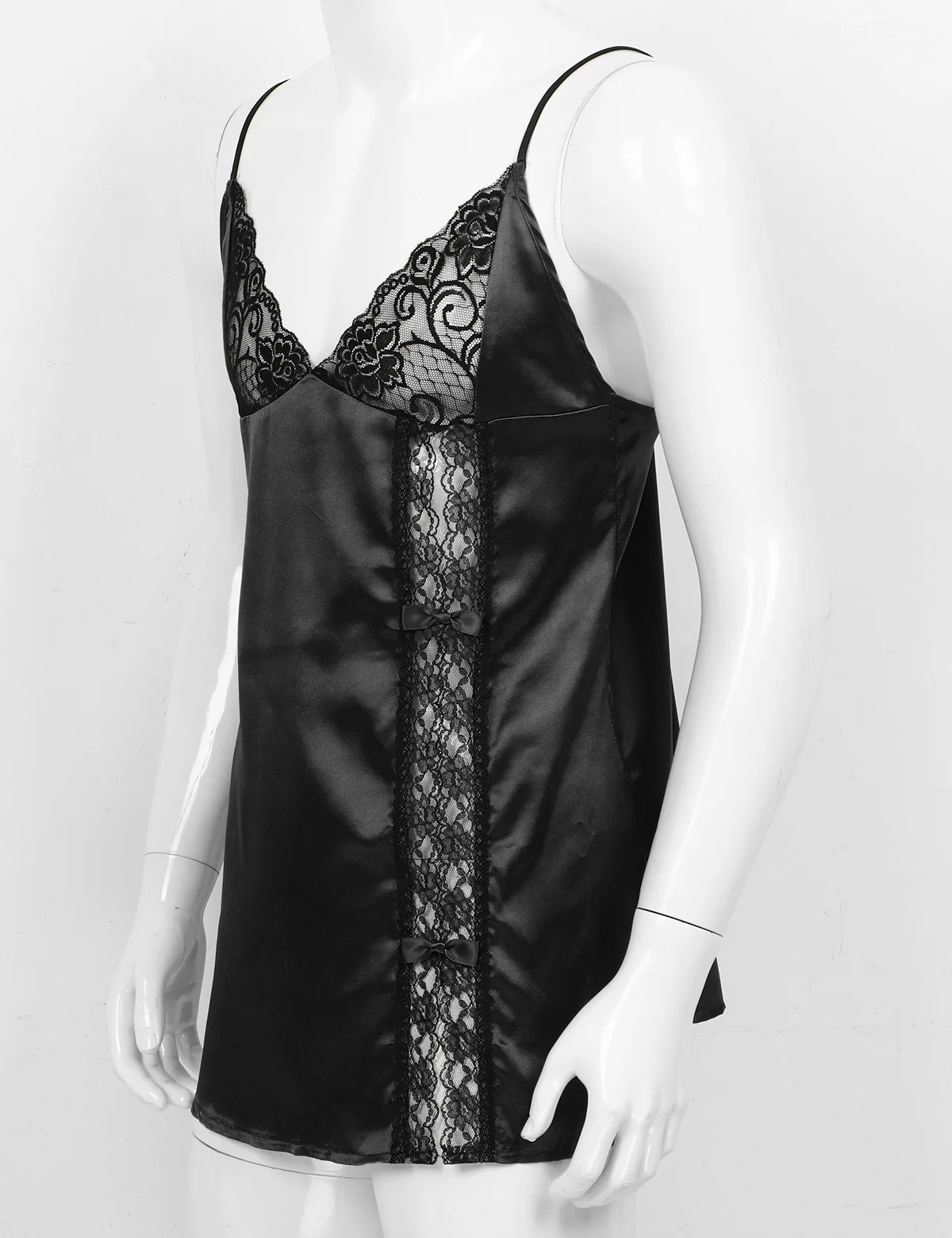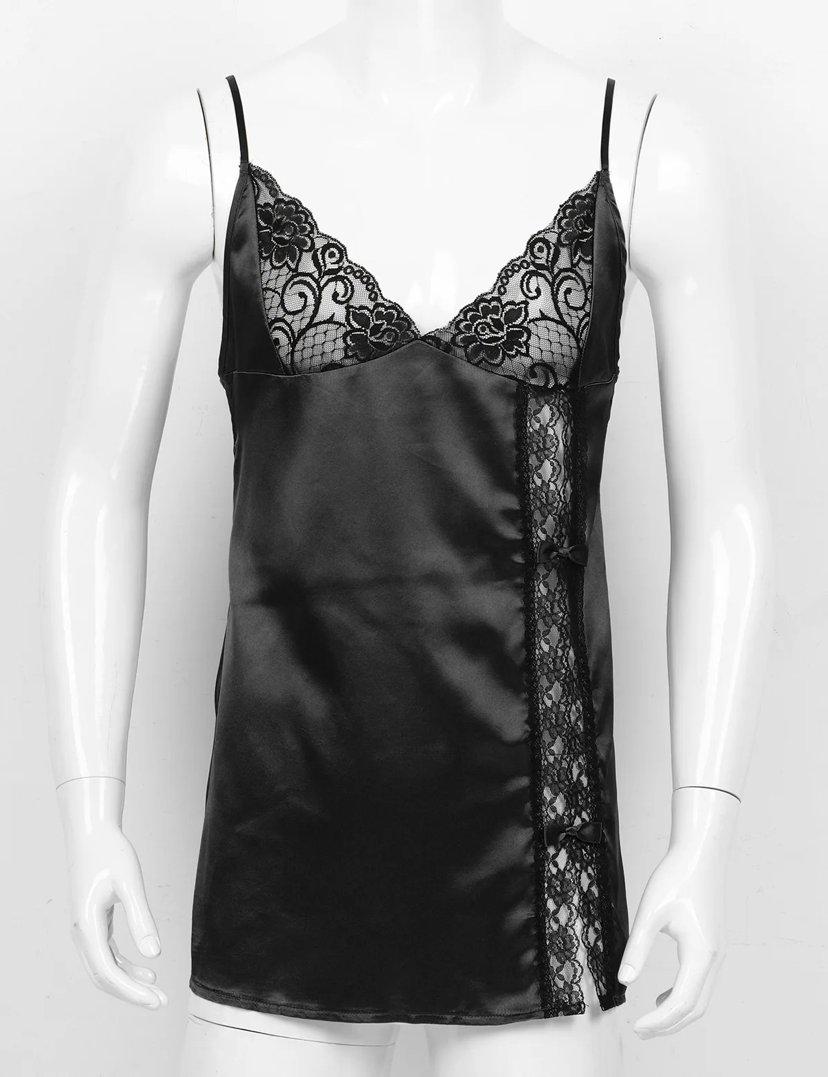 Регулируемые бретельки-спагетти и глубокий v-образный вырез, боковая расцветка с кружевной отделкой и бантиками.