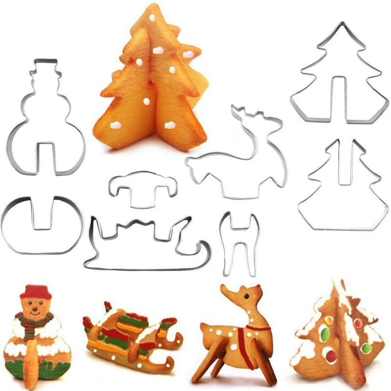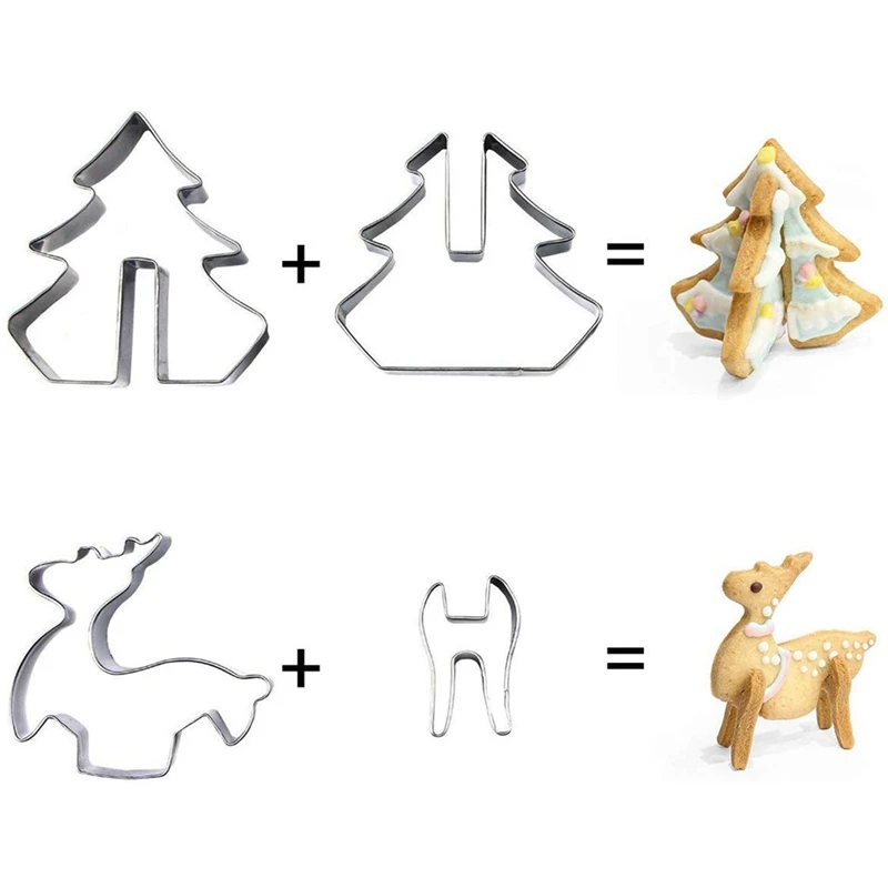 1. Две формы рождественской елки, один с разрезом сверху и один с разрезом внизу, чтобы быть вместе и сделано, чтобы стоять вверх. 2. Один Снеговик резак с меньшим круглым резаком, чтобы положить на нижний шар снеговика.