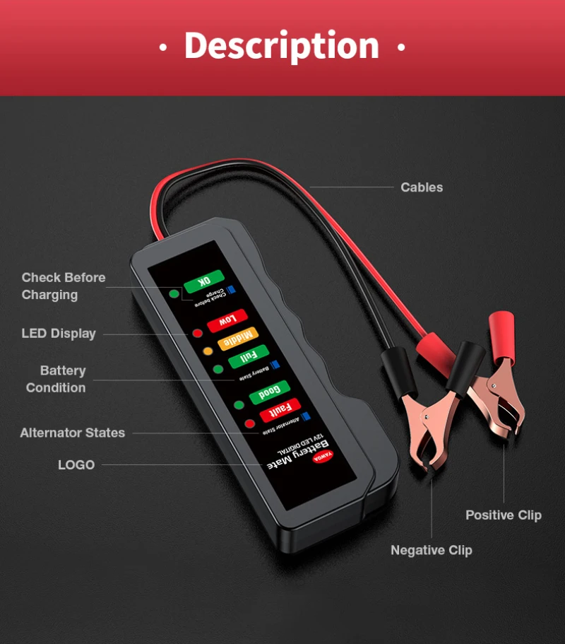 Подходит для 12 В свинцово-кислотных батарей, твердых батарей, разрядных батарей и батарей без технического обслуживания тяжелых изолированных хомутов.