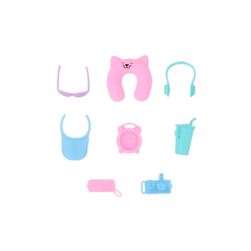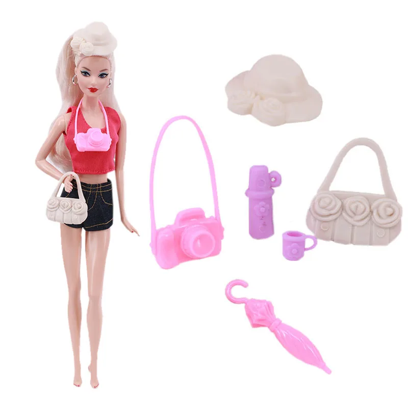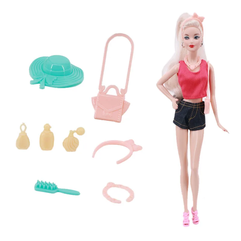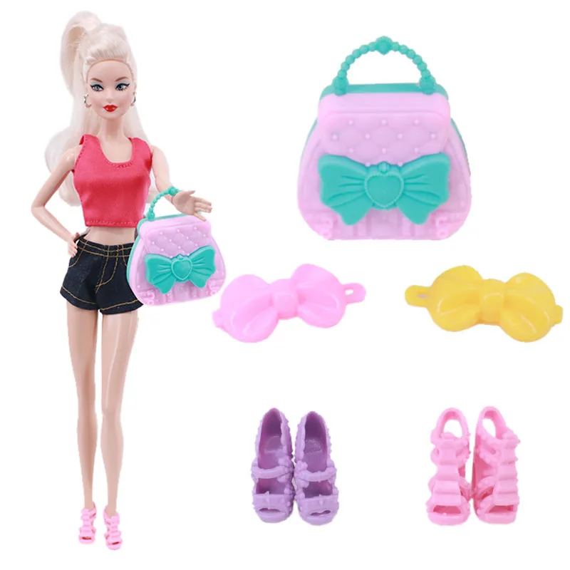 40 предметов/набор кукольных аксессуаров = 5 очков + 4 ожерелья + 5 пар высоких каблуков (10 штук) + 10 юбок на подтяжках + 1 сумка в случайном порядке + 10 вешалок